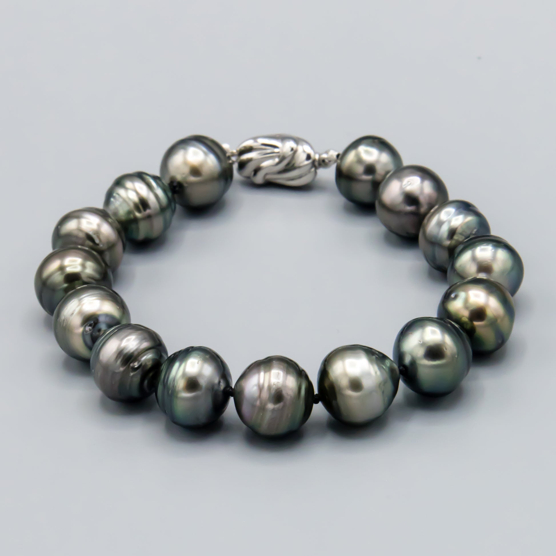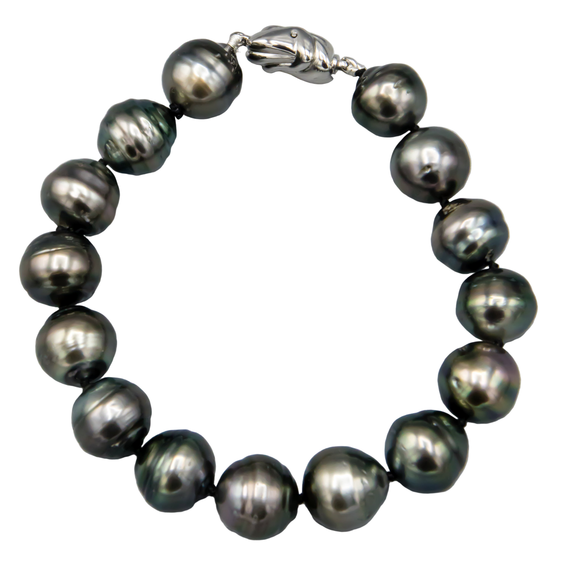 This elegant bracelet showcases lustrous baroque Tahitian pearls measuring 11-11.5mm, strung across a refined 7.5-inch length. Secured with a sterling silver needle clasp, it combines timeless sophistication with the natural beauty of saltwater cultured pearls, making it an understated yet striking addition to any jewelry collection.