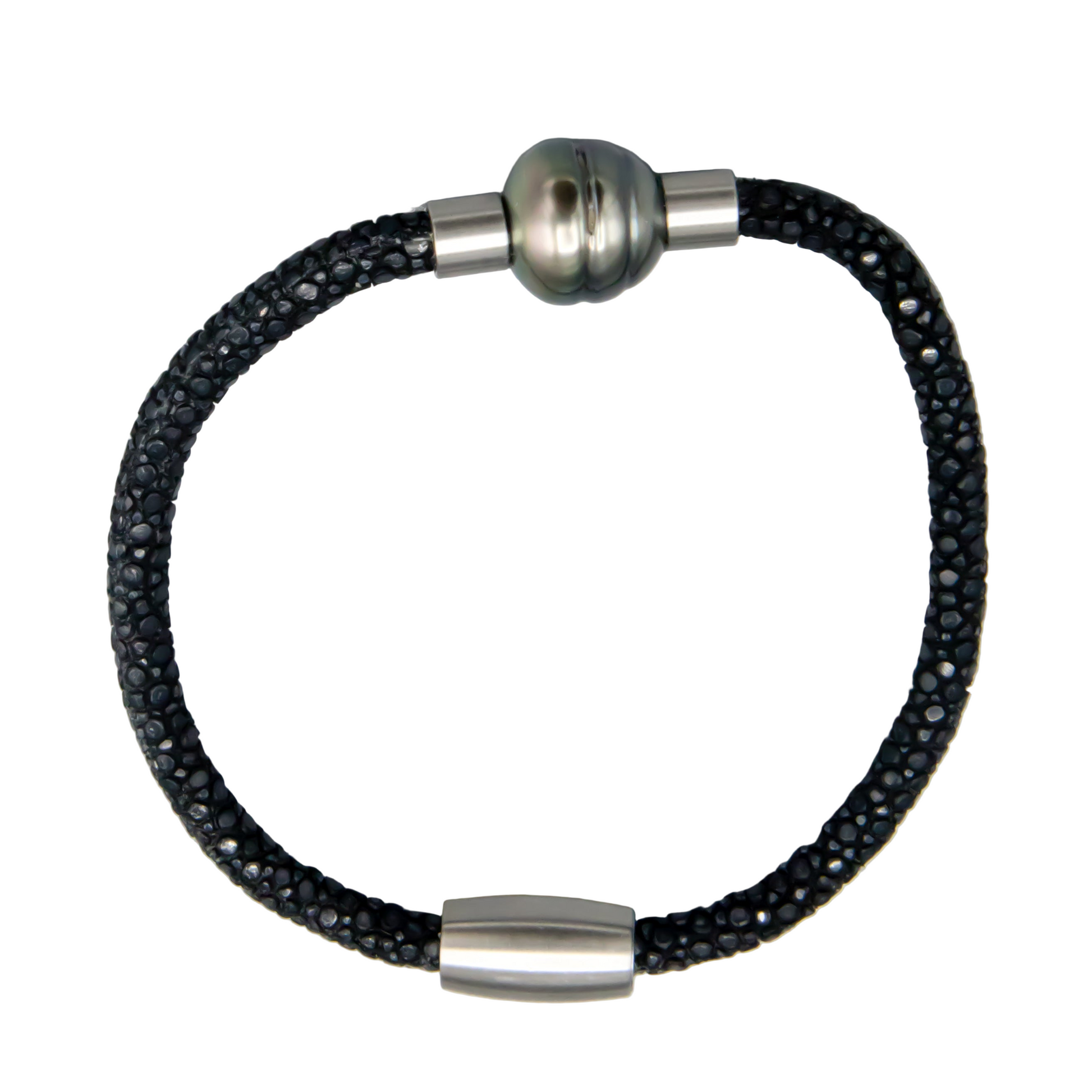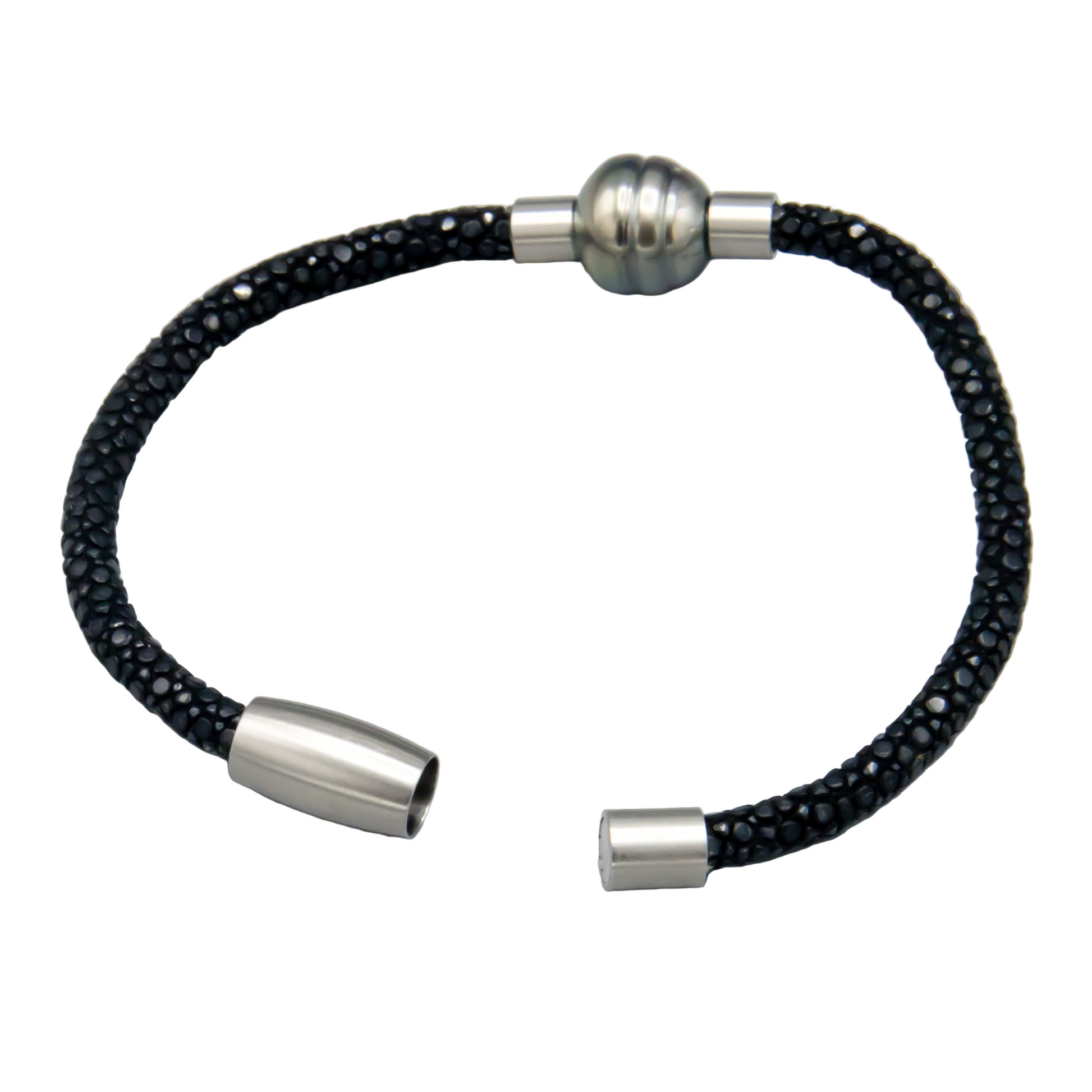 This elegant bracelet combines the distinctive texture of black stingray leather with a luminous baroque Tahitian saltwater cultured pearl, creating a striking contrast of natural materials. The 7.5-inch length offers a refined fit, while the stainless steel magnetic clasp ensures secure, effortless fastening. A sophisticated accessory that seamlessly transitions from day to evening wear.