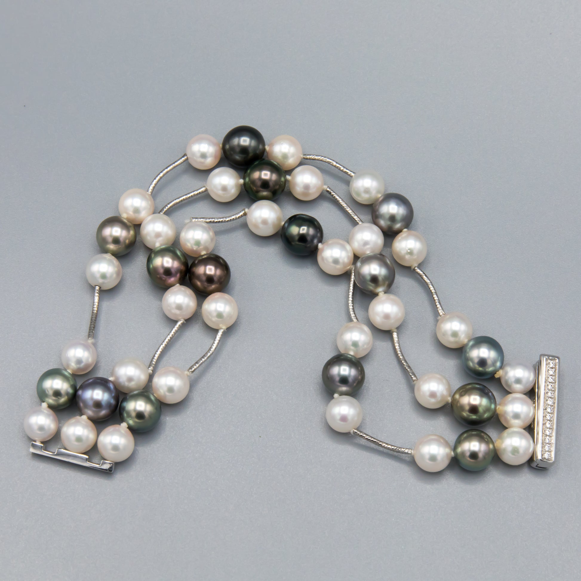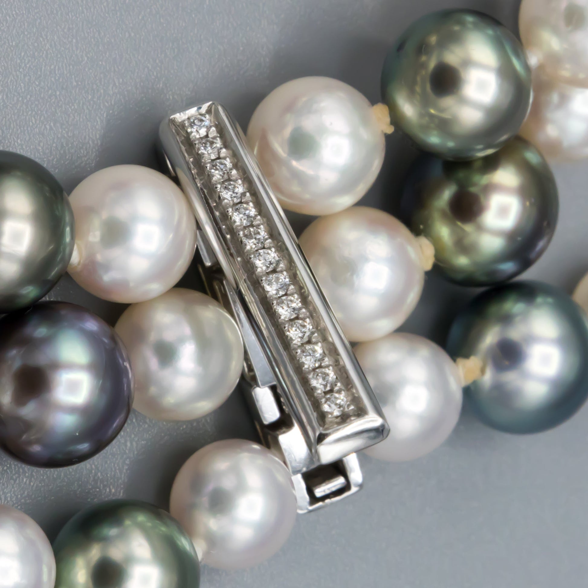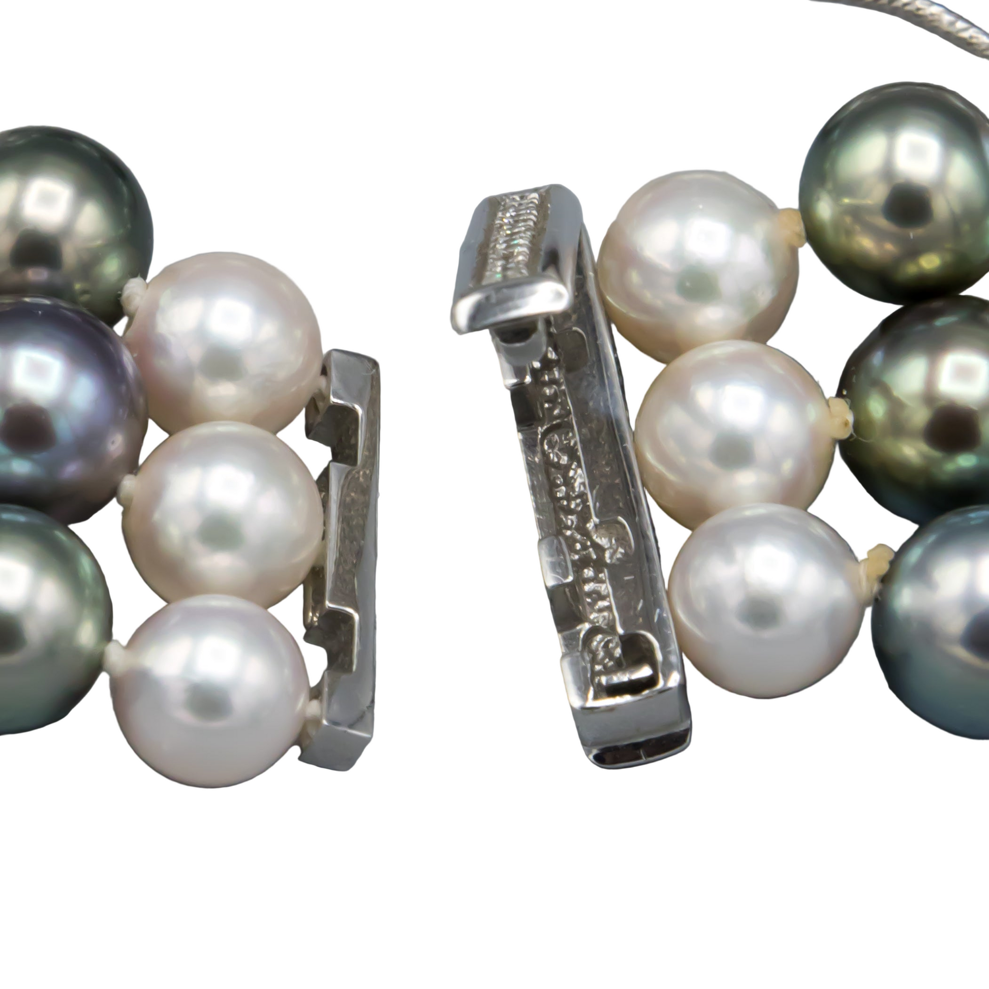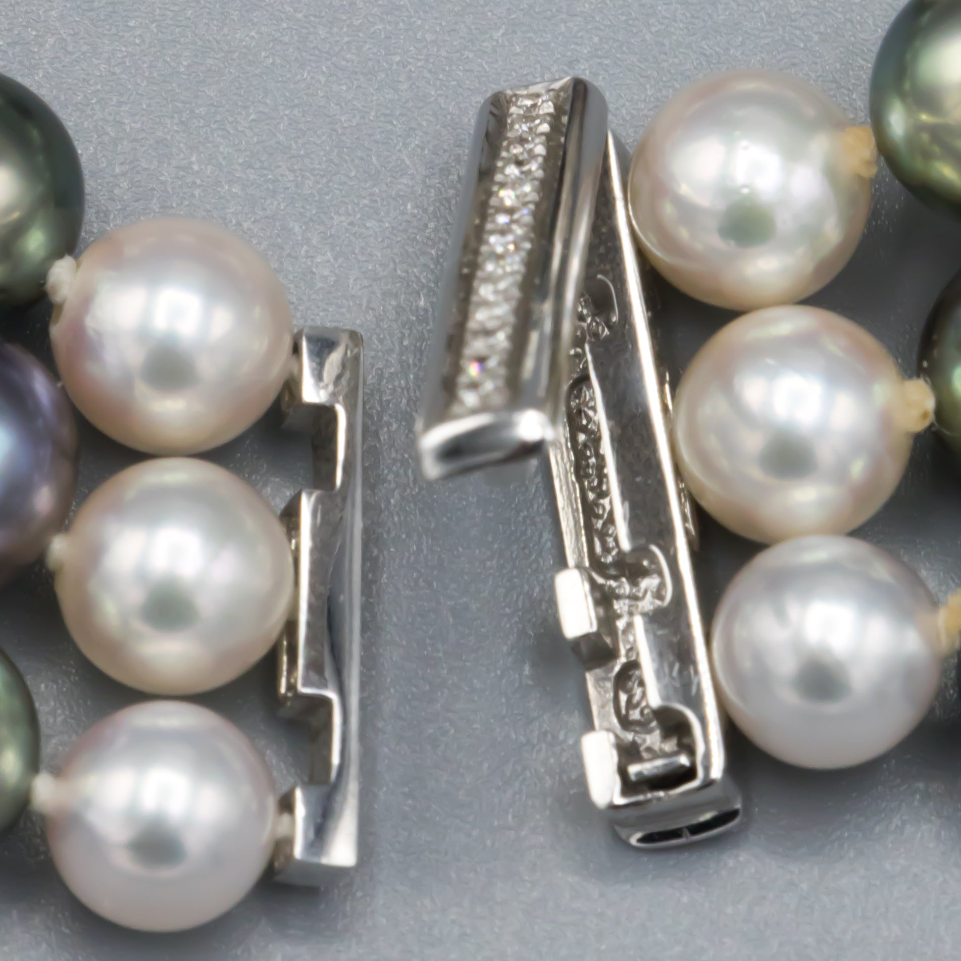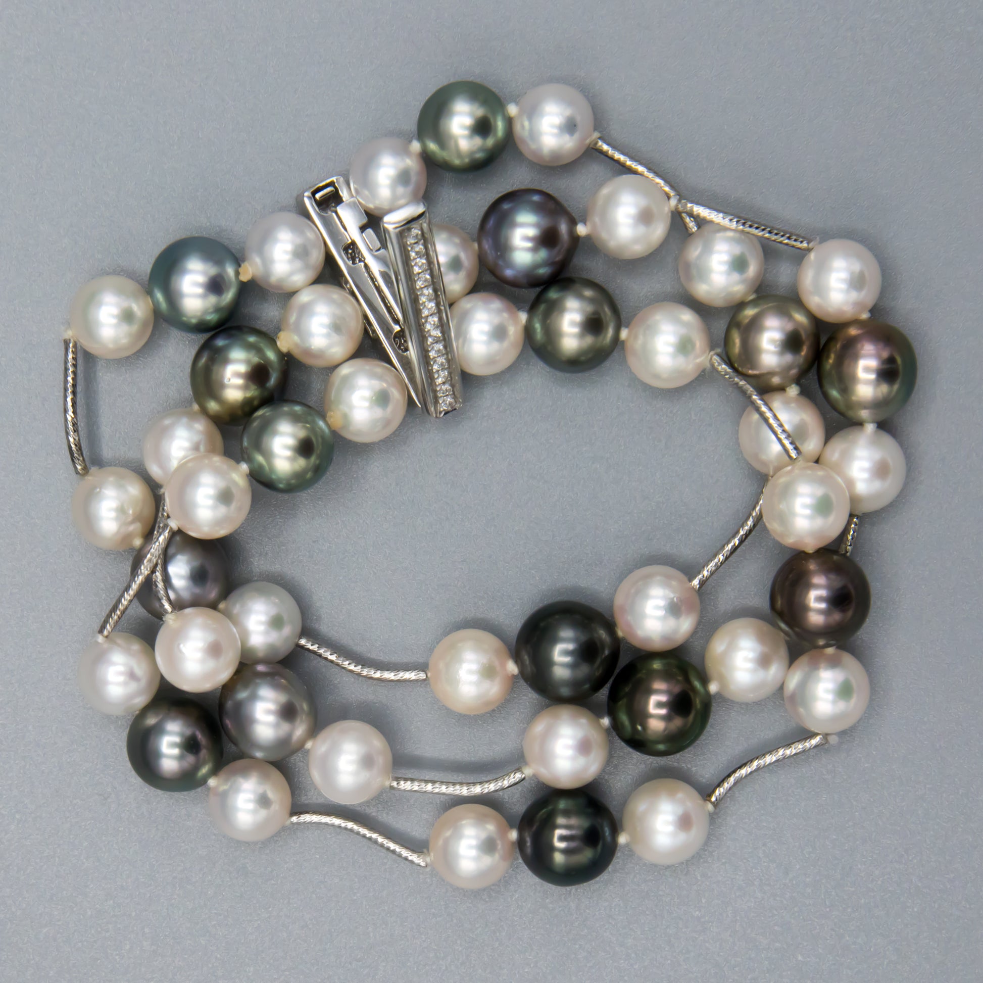 Elevate your wrist with this refined triple-strand bracelet, seamlessly blending lustrous Akoya and Tahitian saltwater pearls in graduating sizes from 7.5 to 9.5mm. The 7-inch design drapes elegantly, while the 14k white gold Italian diamond clasp adds a touch of timeless luxury. A sophisticated piece that transitions effortlessly from day to evening wear.