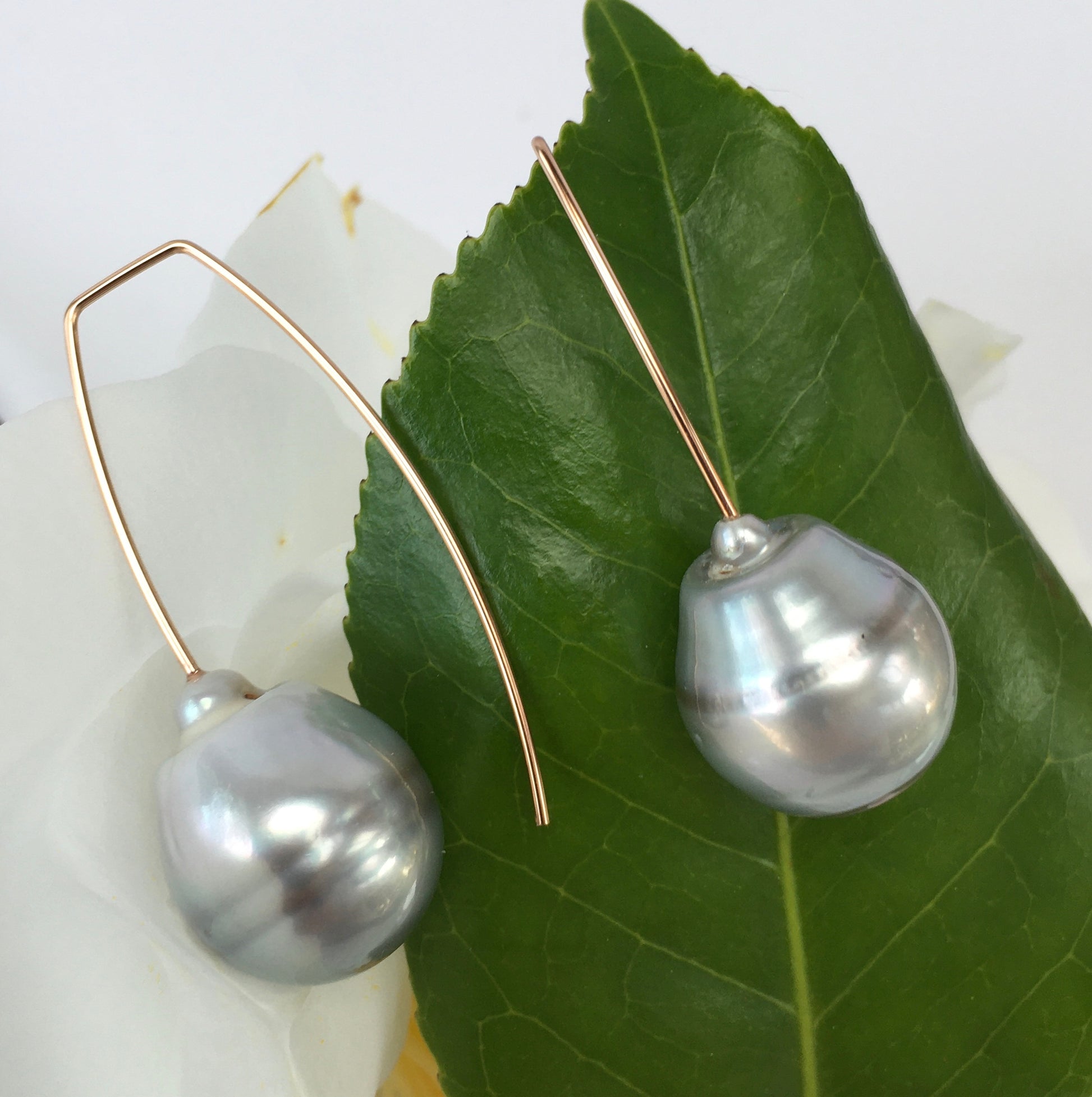 Elevate your jewelry collection with these refined Tahitian pearl earrings, featuring lustrous 15.5mm gray baroque pearls suspended from delicate 14K rose gold wire. The organic, irregular shape of baroque pearls adds distinctive character and movement, while the warm rose gold complements the pearls' sophisticated gray tone. Perfect for adding understated elegance to both everyday wear and special occasions, these earrings showcase the timeless beauty of cultured saltwater pearls with contemporary styling.