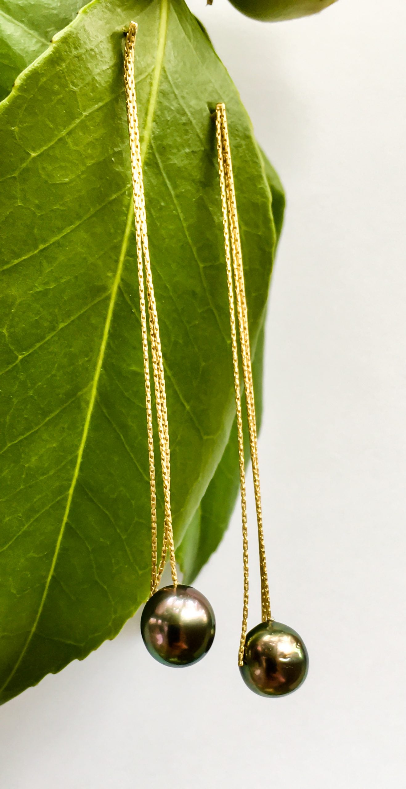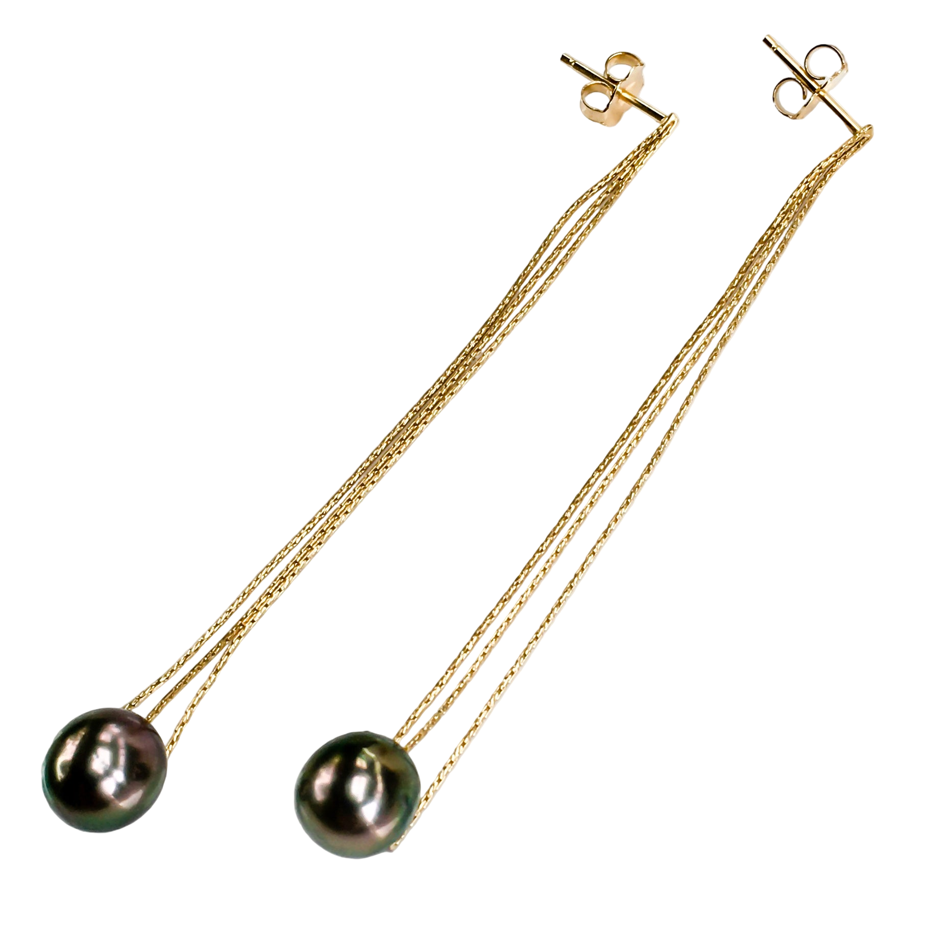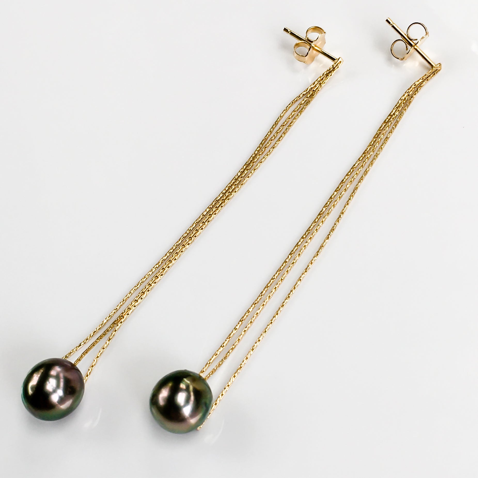 Elevate your elegance with these 8mm Tahitian saltwater cultured pearl earrings, beautifully set in 14K yellow gold. The delicate tassel dangle design adds a refined movement, perfectly blending classic sophistication with modern flair. Ideal for adding a touch of timeless luxury to any ensemble.
