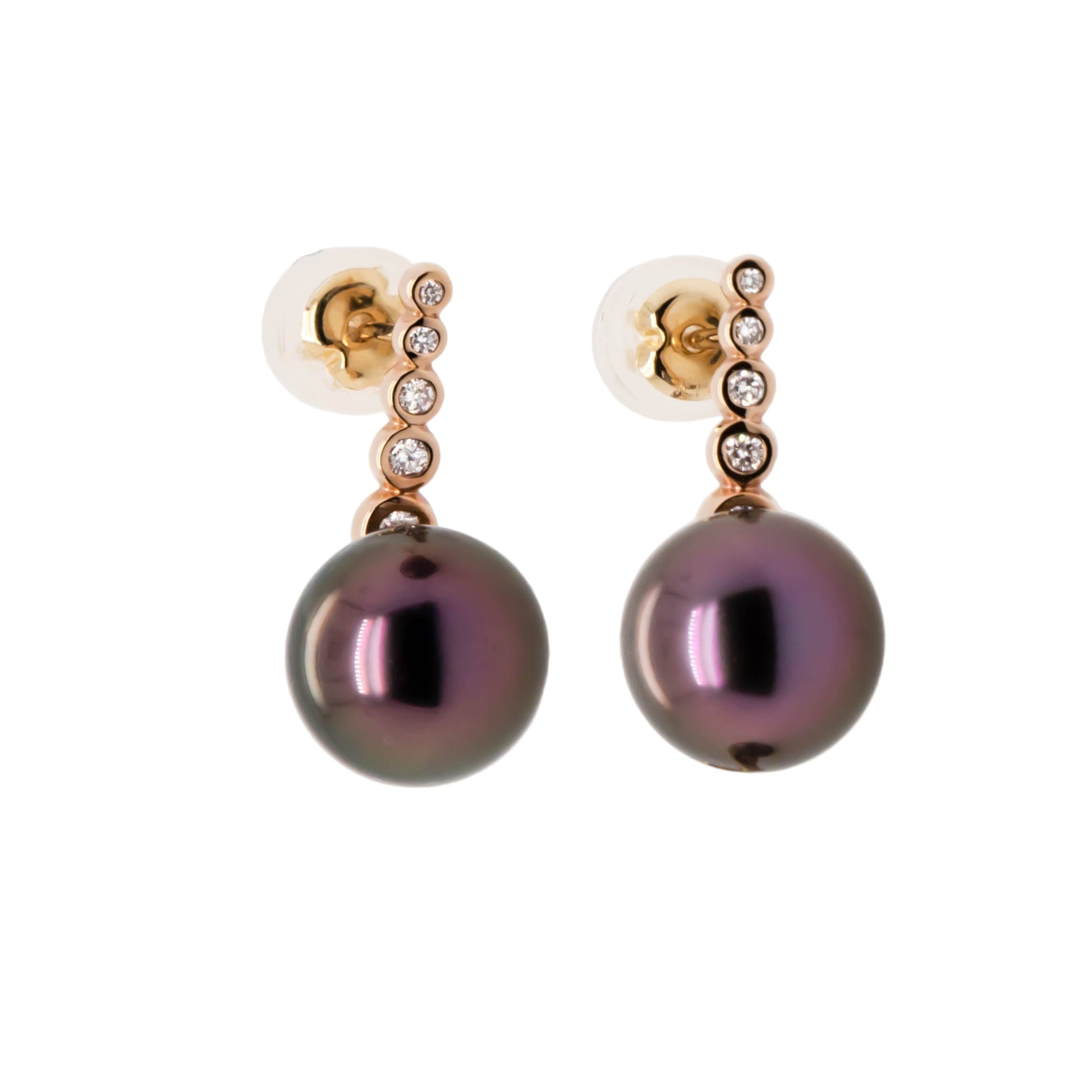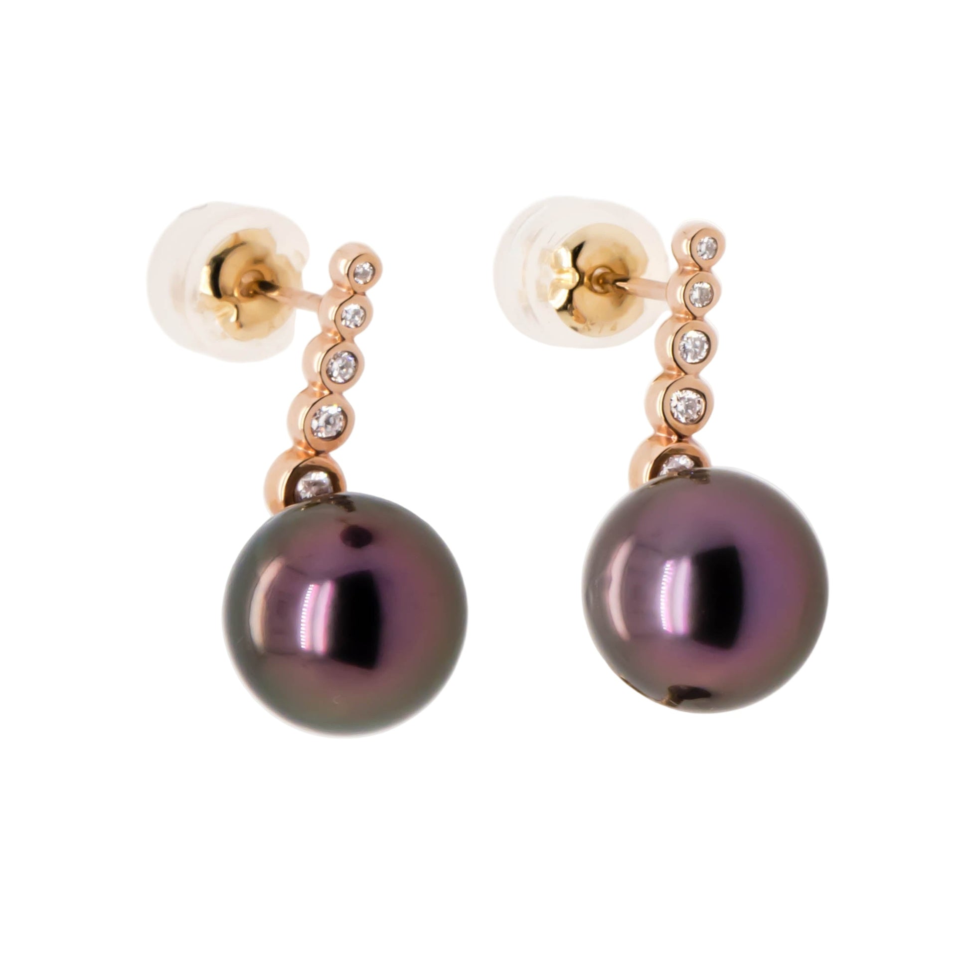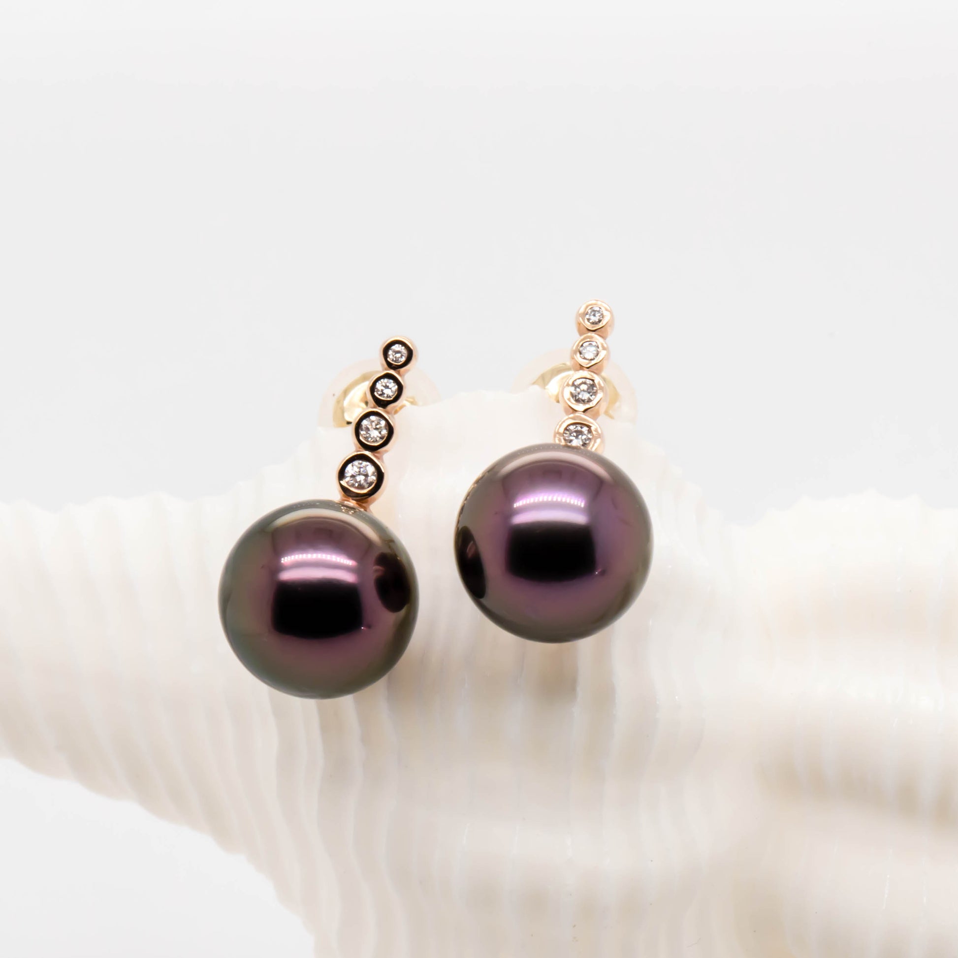 These exquisite earrings showcase 9.3mm Tahitian saltwater cultured pearls, elegantly paired with 14k rose gold settings, each one accented by 4 sparkling diamonds. Their refined design adds a touch of sophistication, making them perfect for elevating any ensemble with timeless luxury.