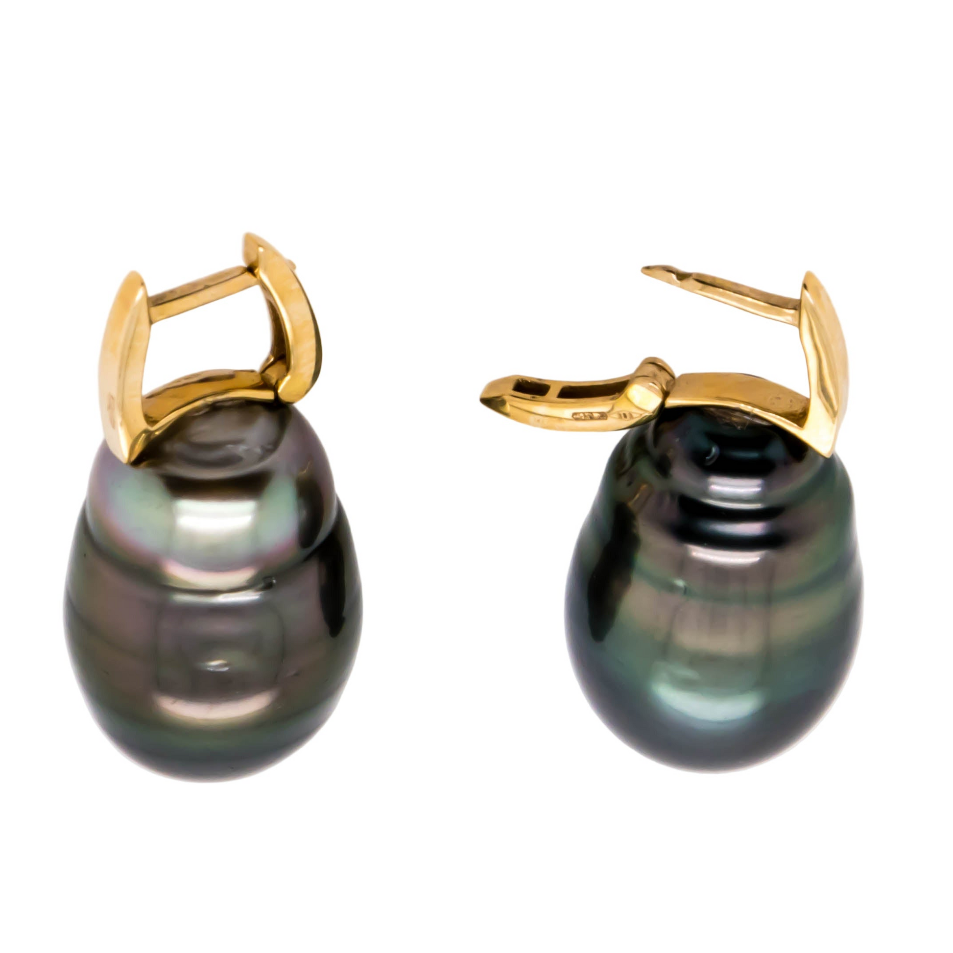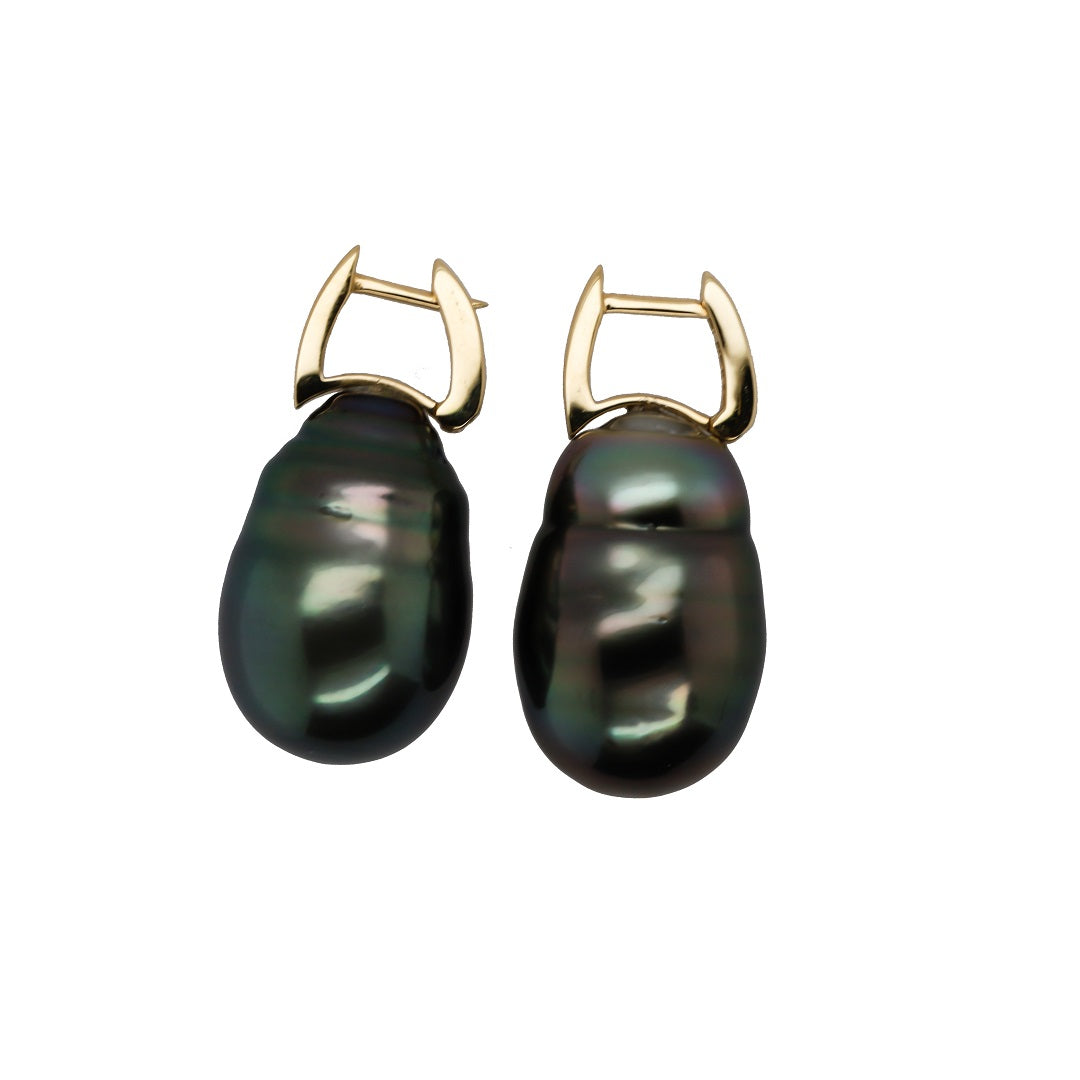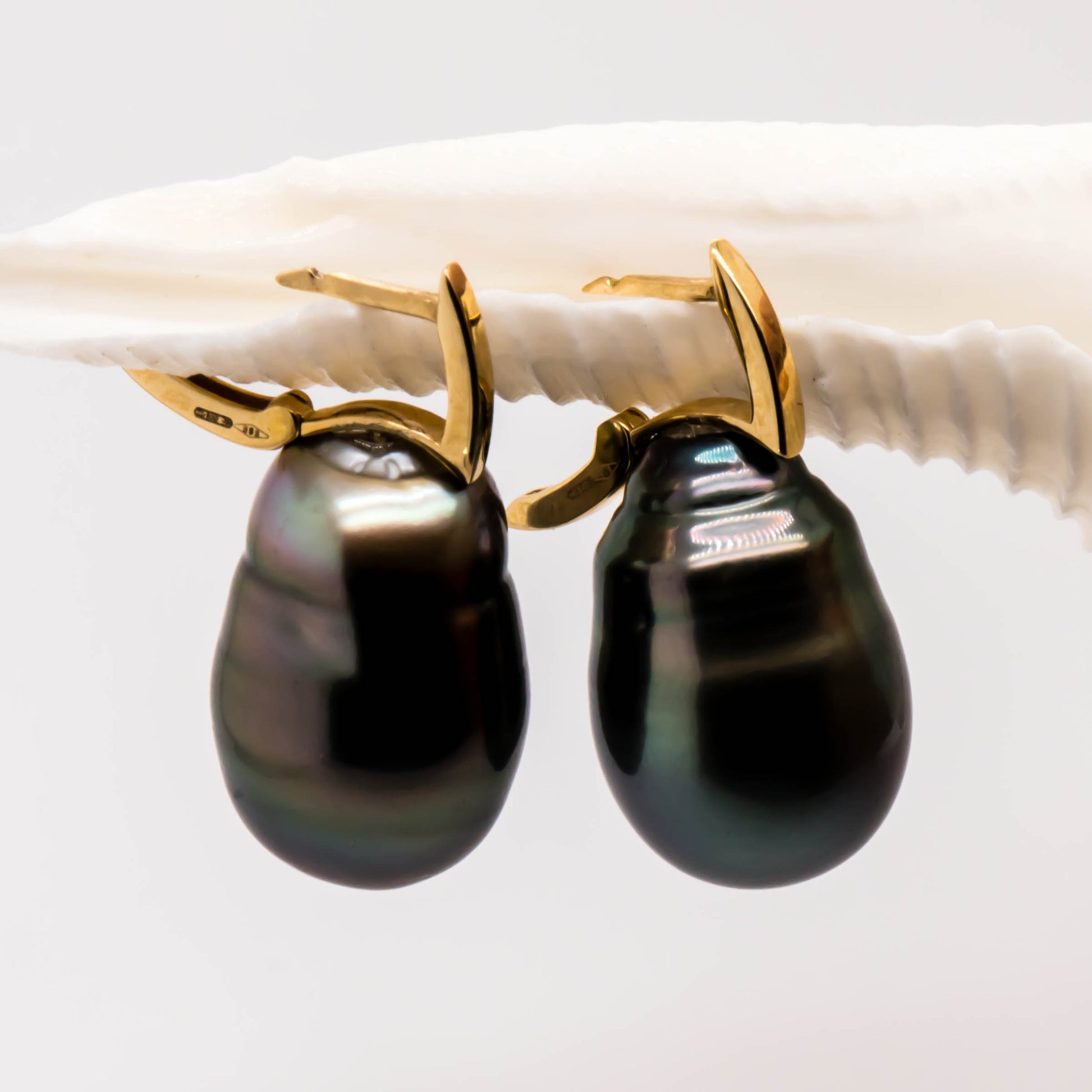 Elevate your elegance with these exquisite 12.7mm baroque teardrop Tahitian saltwater cultured pearl earrings. Each unique pearl showcases natural luster and captivating shape, attached to sturdy 14K yellow gold French hook settings for a refined finish. Perfect for adding an understated yet luxurious touch to any ensemble.