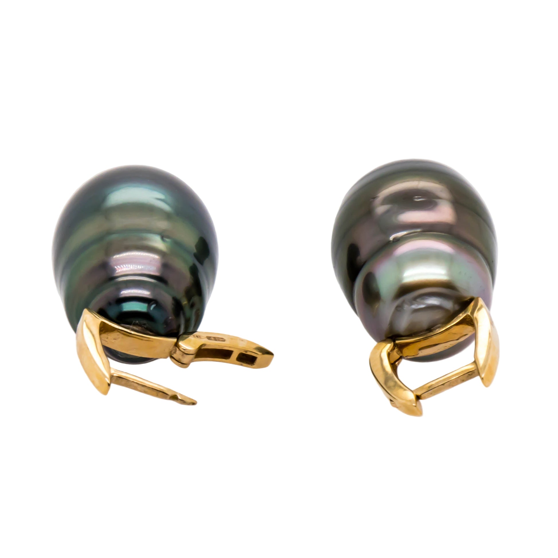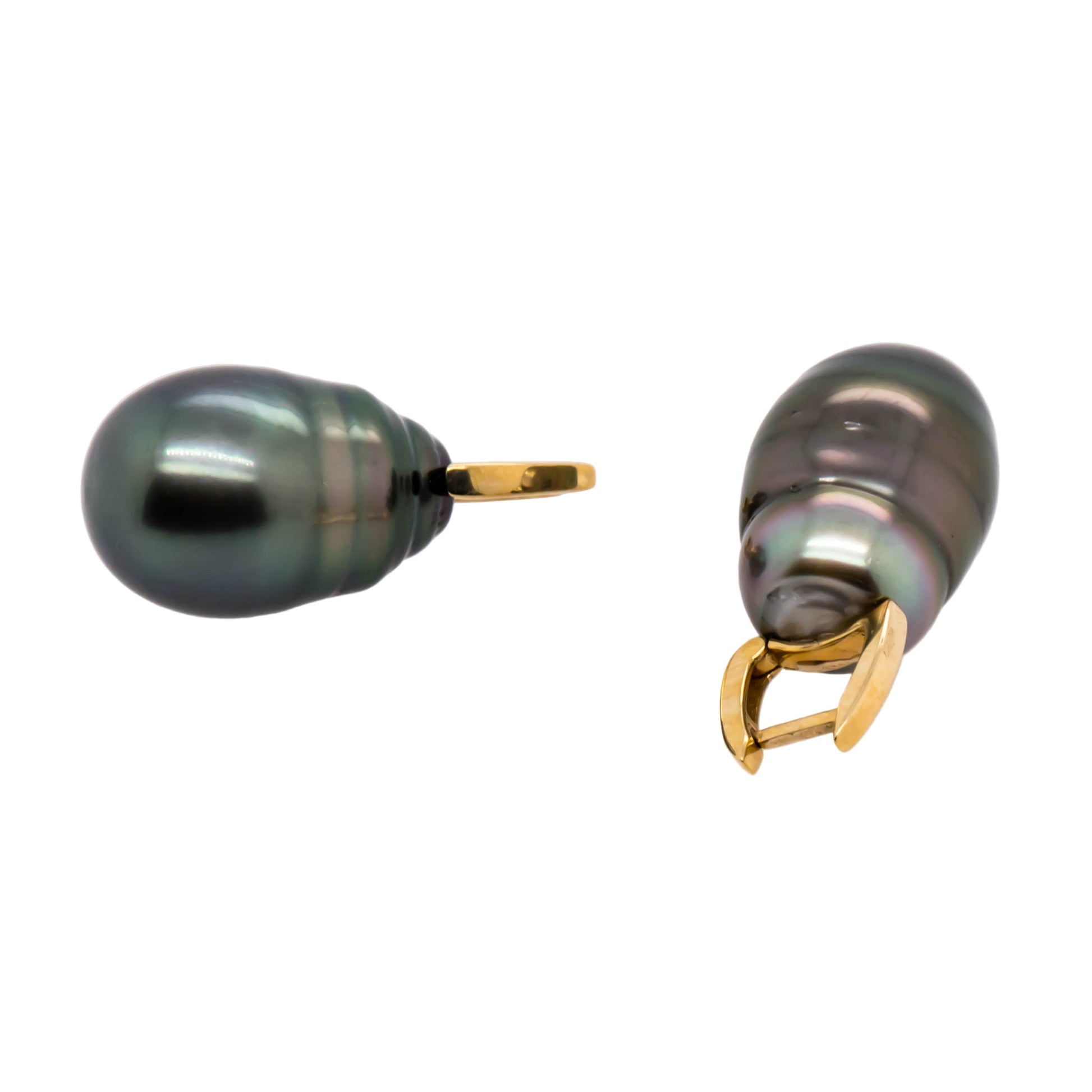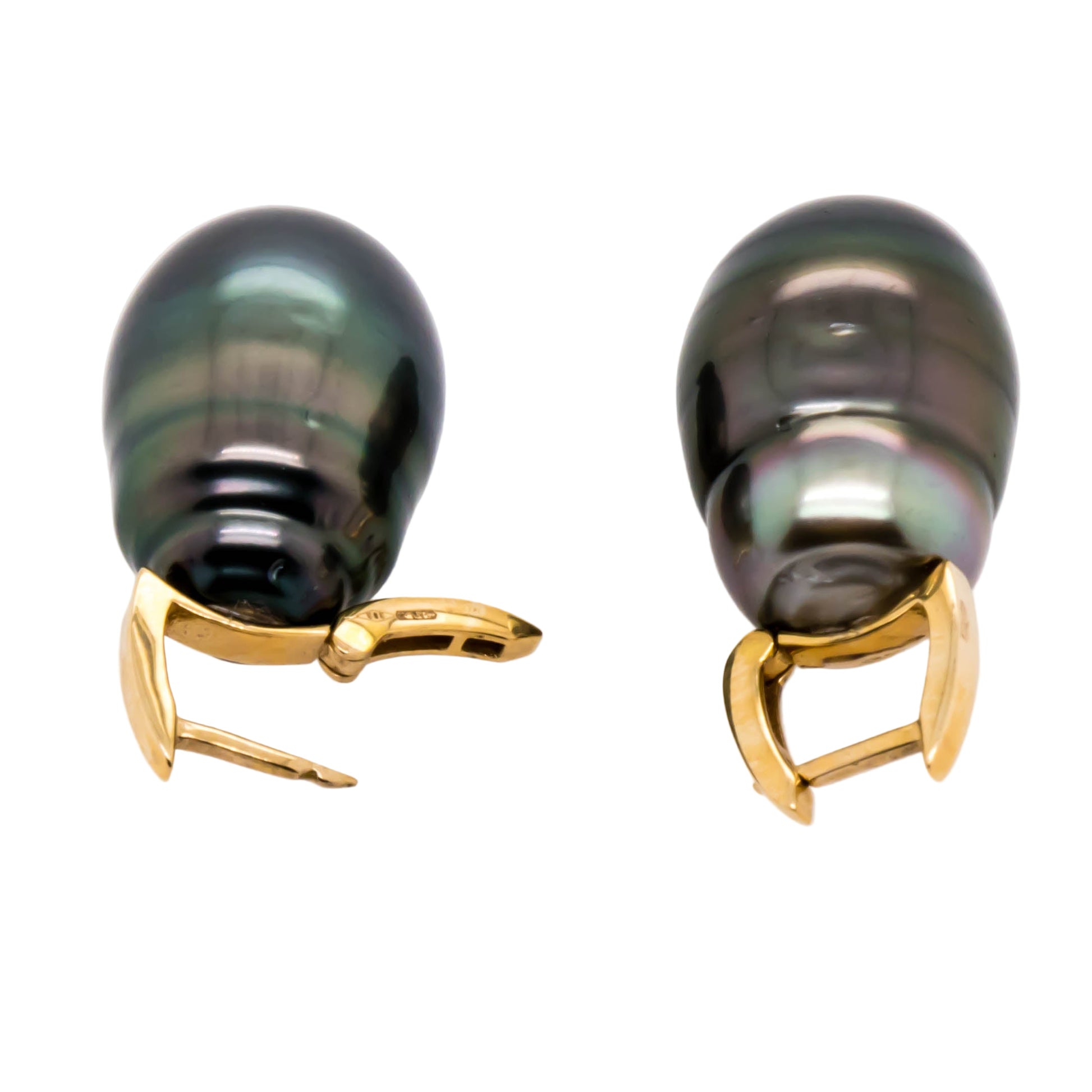 Elevate your elegance with these exquisite 12.7mm baroque teardrop Tahitian saltwater cultured pearl earrings. Each unique pearl showcases natural luster and captivating shape, attached to sturdy 14K yellow gold French hook settings for a refined finish. Perfect for adding an understated yet luxurious touch to any ensemble.