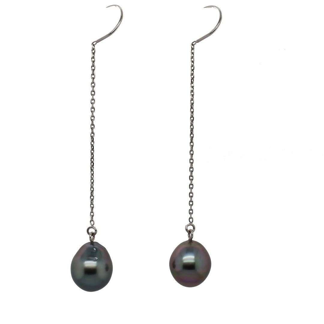 Elevate your elegance with these 9–9.5mm teardrop Tahitian saltwater cultured pearls, each exhibiting a unique, natural luster. Suspended from 14K white gold threader earrings, this design balances timeless sophistication with modern grace, making a perfect statement for any occasion.