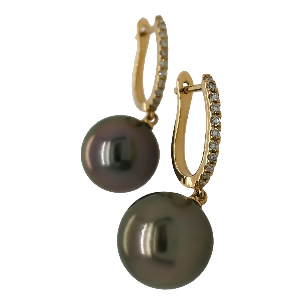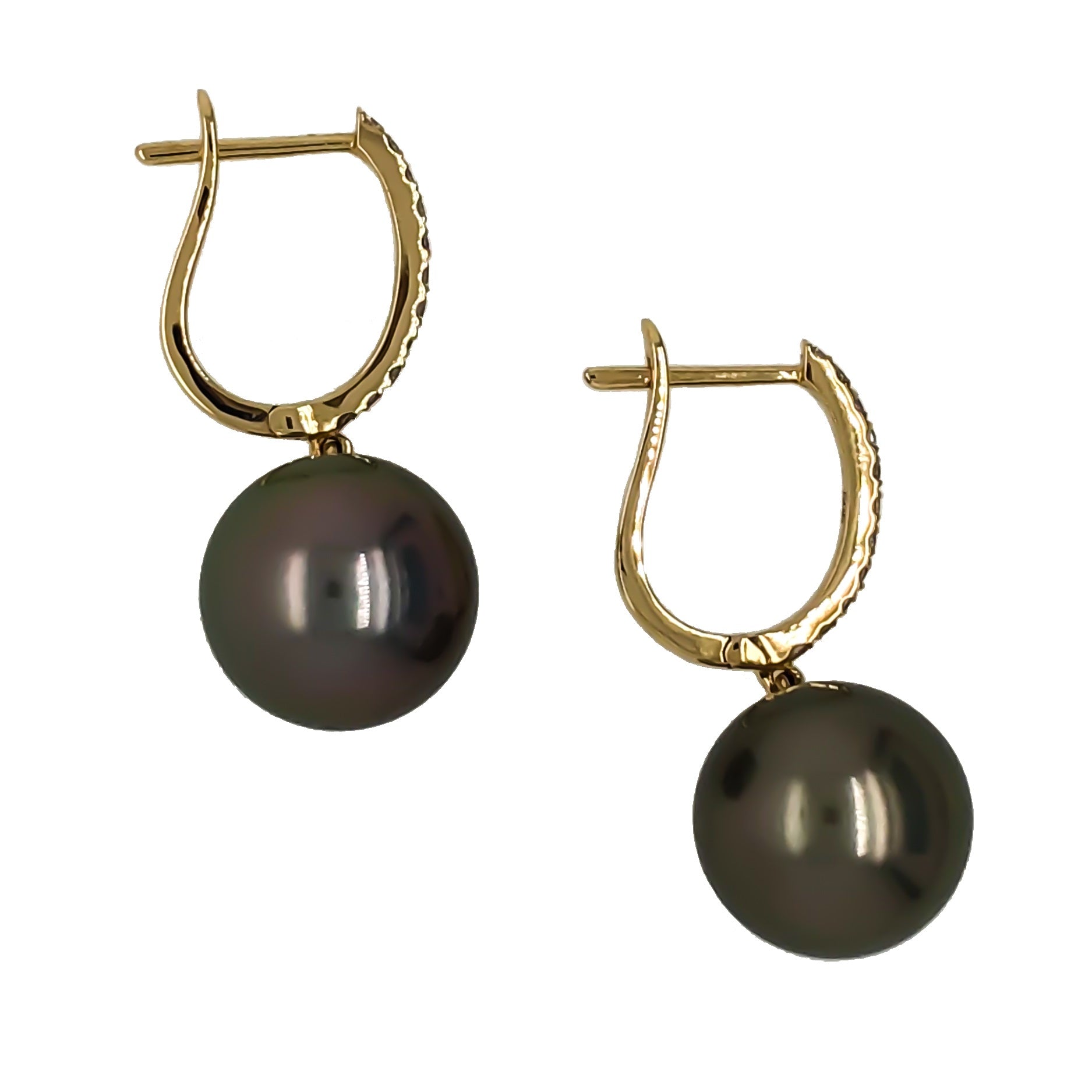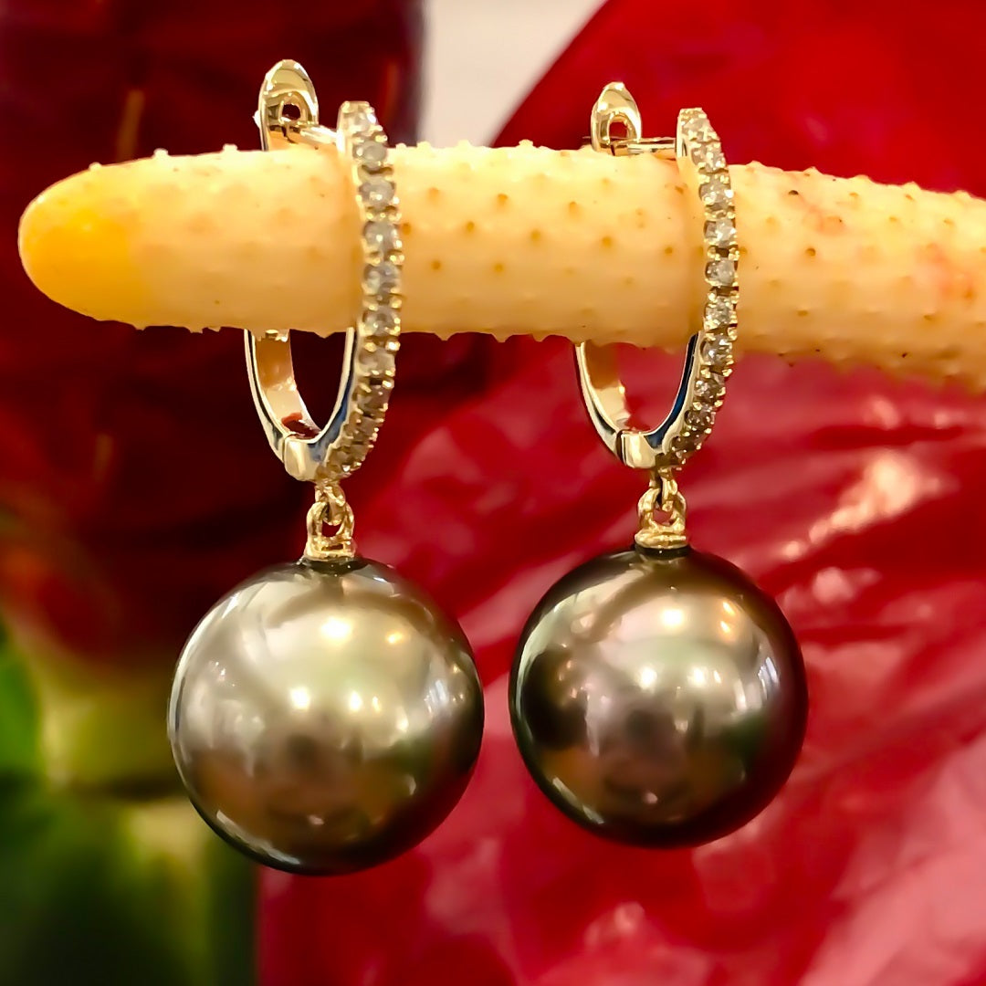 These exquisite earrings feature 12-13mm Tahitian saltwater cultured pearls, renowned for their natural luster and rich color. Set on a hinged 14K yellow gold backing adorned with sparkling diamonds, they offer both elegance and secure comfort. Perfect for those seeking a timeless accessory that combines striking beauty with refined craftsmanship.
