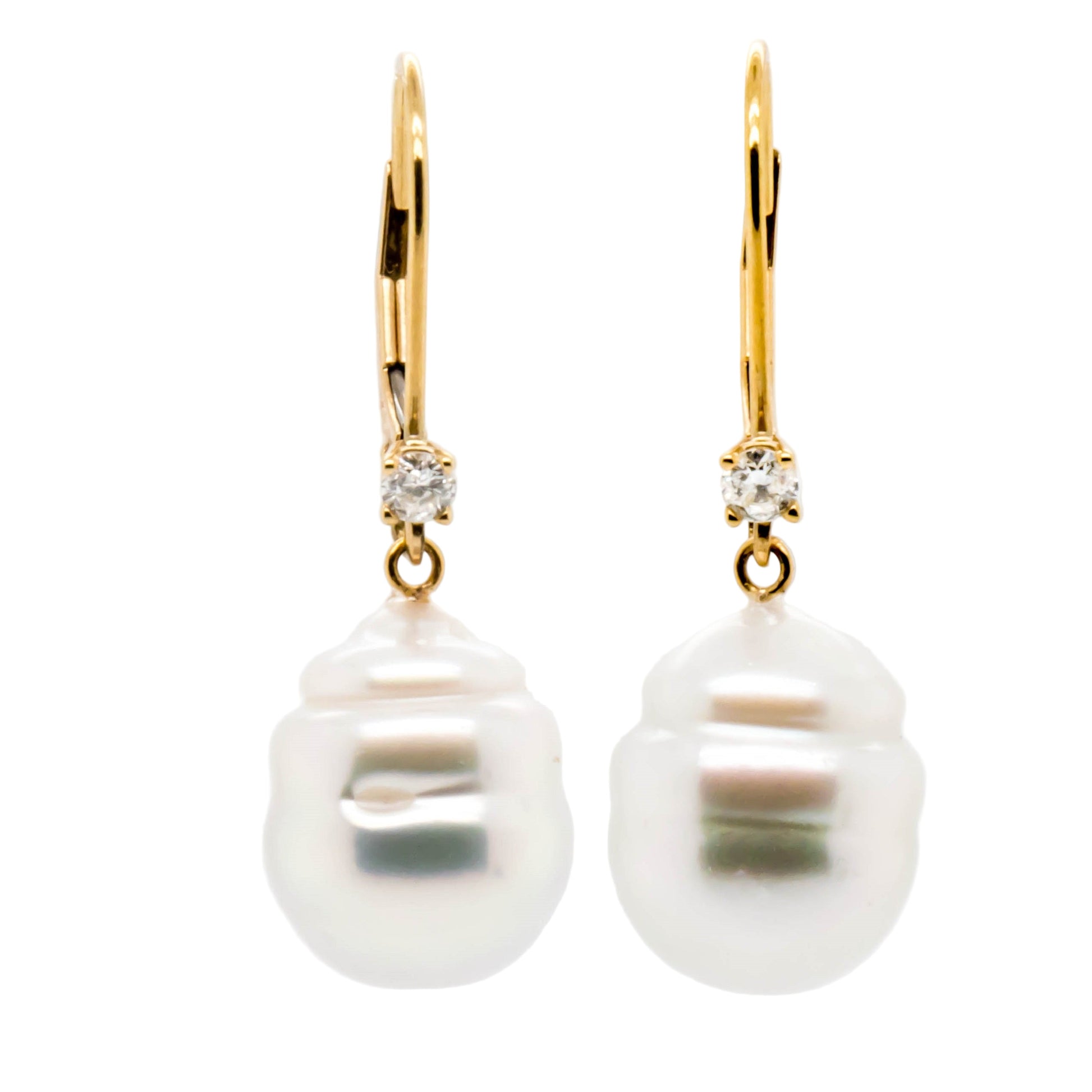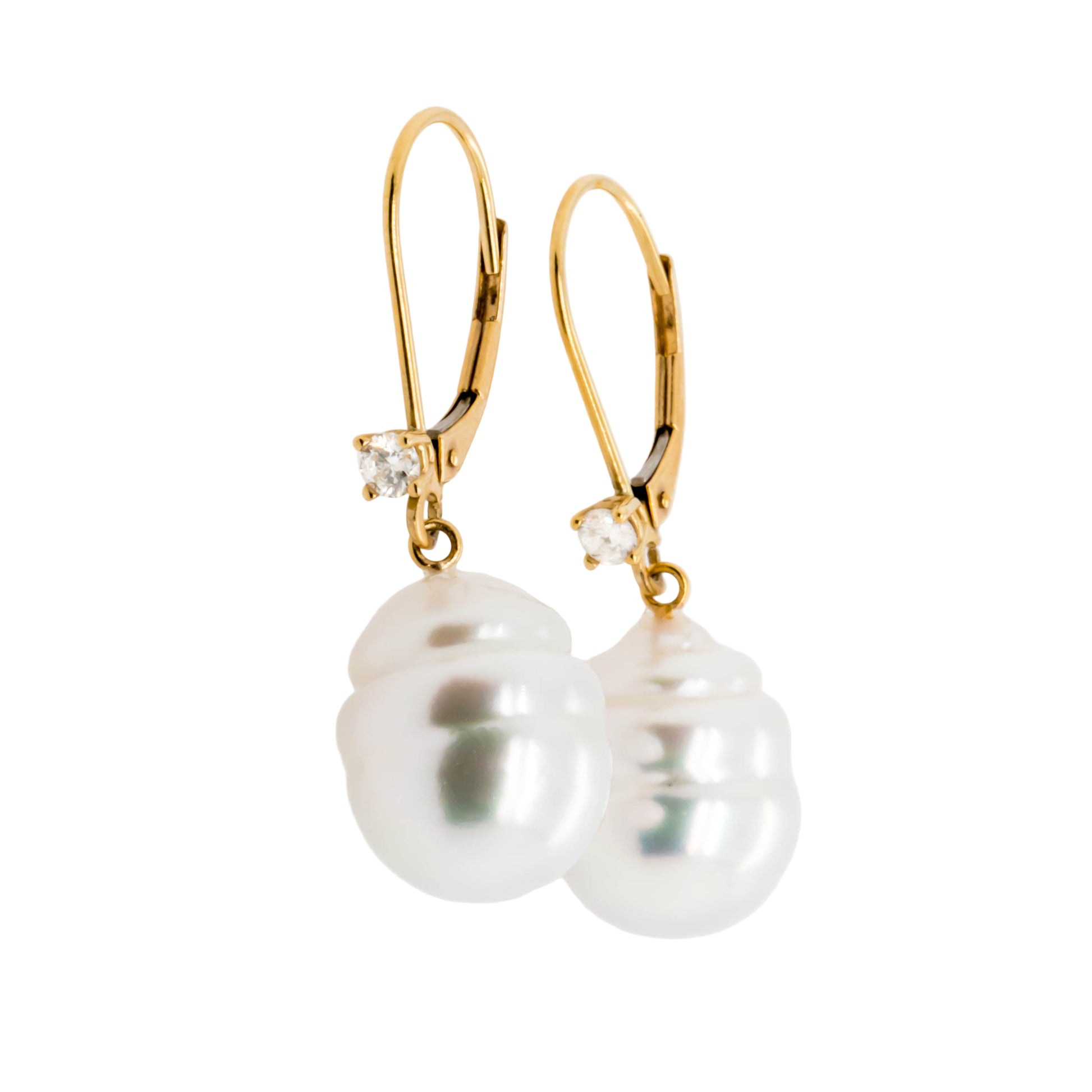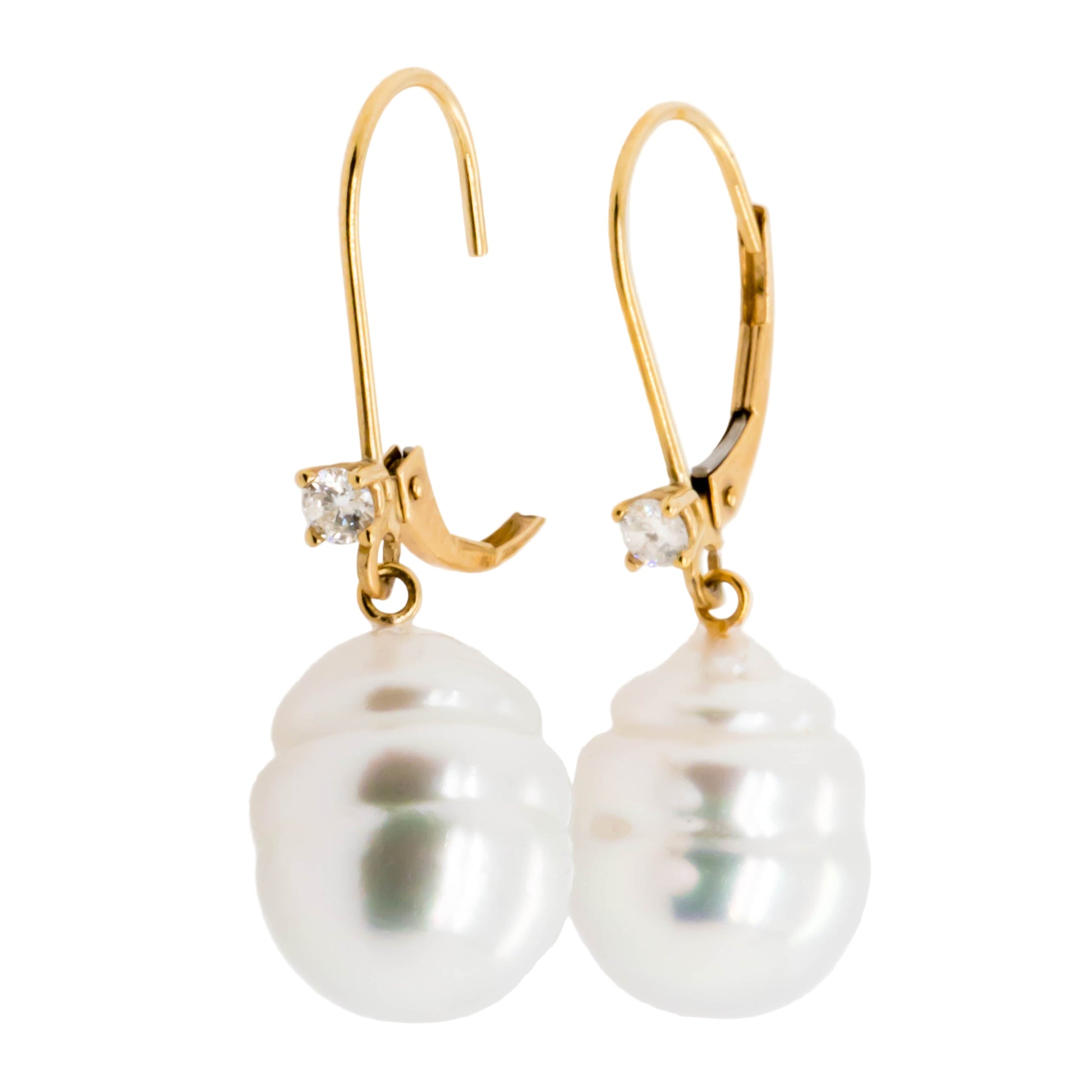 Elegant leverback earrings showcasing lustrous 12-12.5mm baroque Australian south sea cultured pearls suspended from 14K yellow gold settings. The organic, irregular pearl shapes create a refined aesthetic, while the secure leverback closure ensures comfortable all-day wear. A timeless addition to any jewelry collection.
