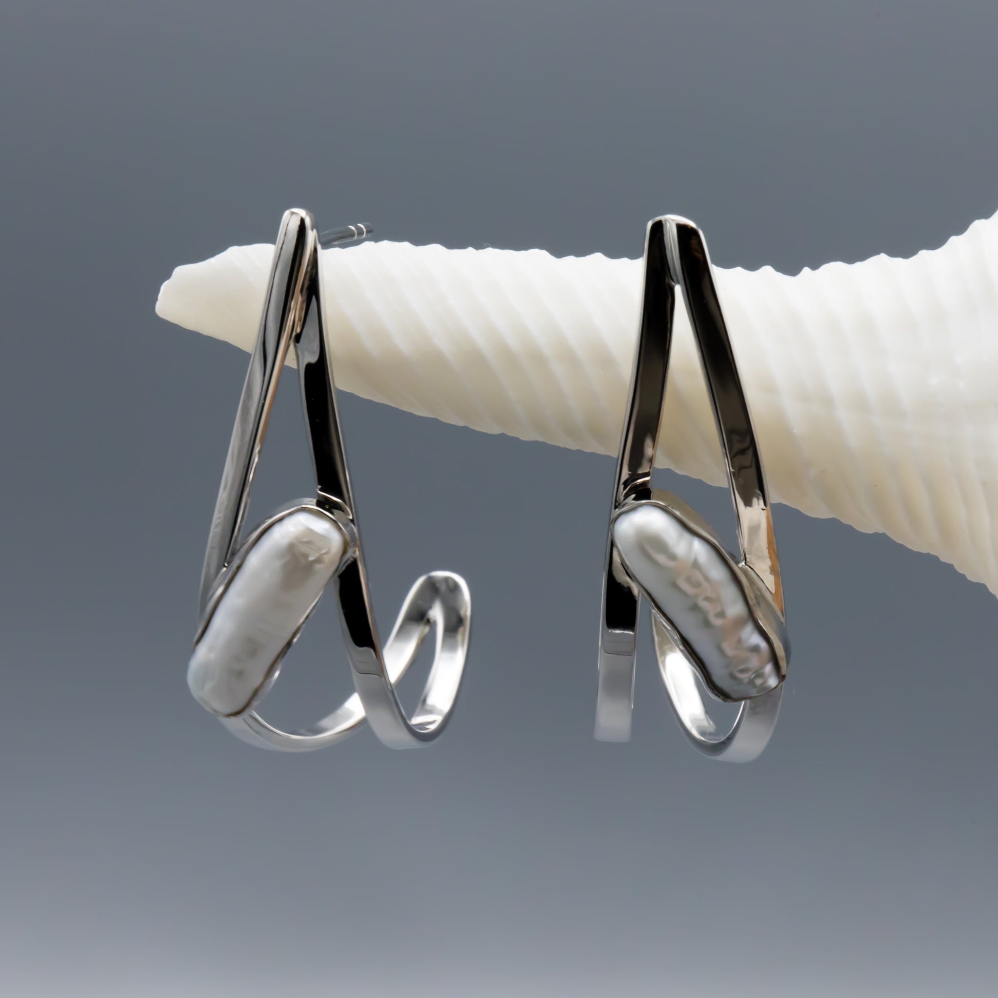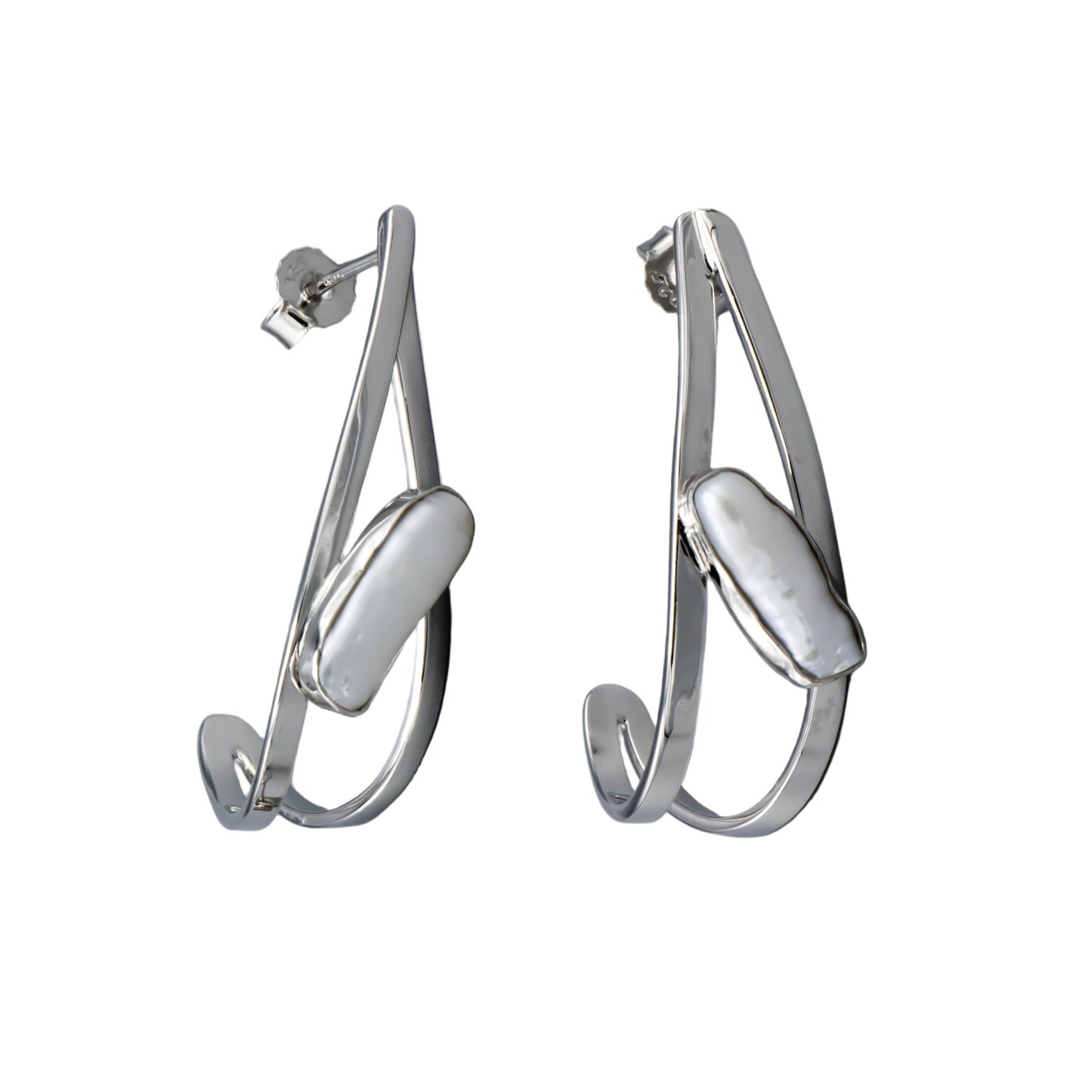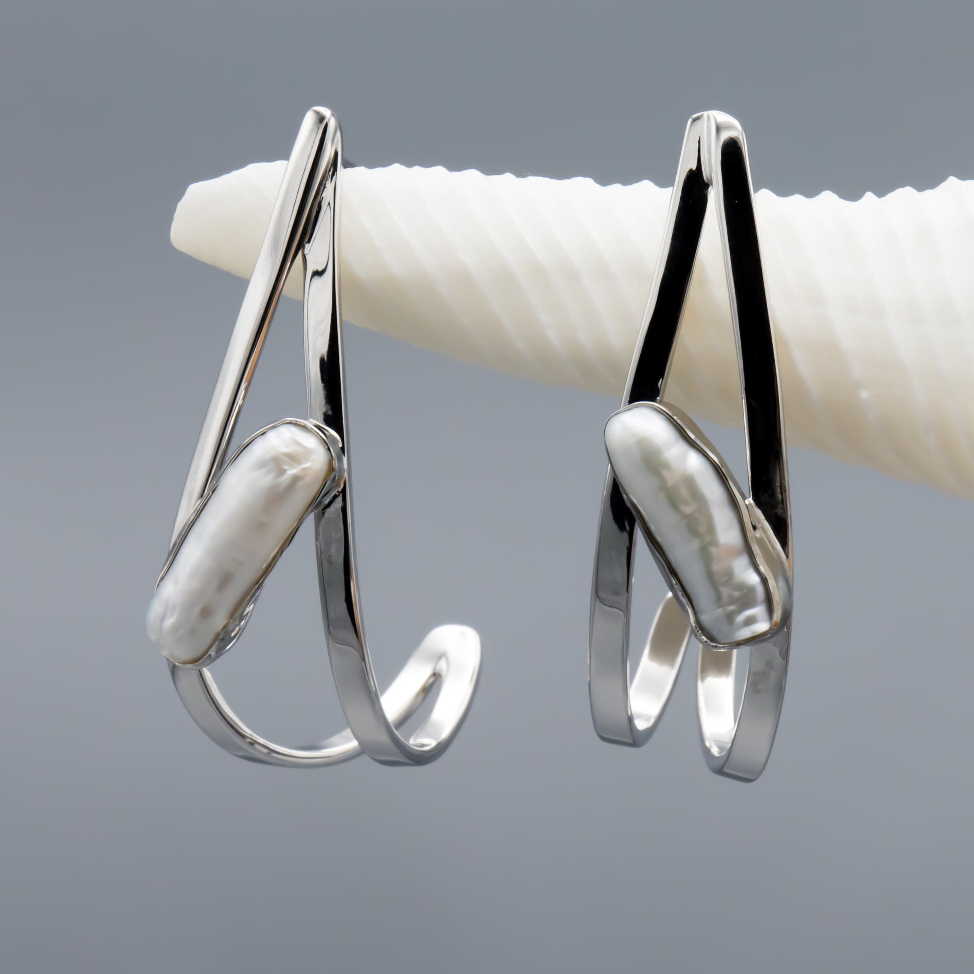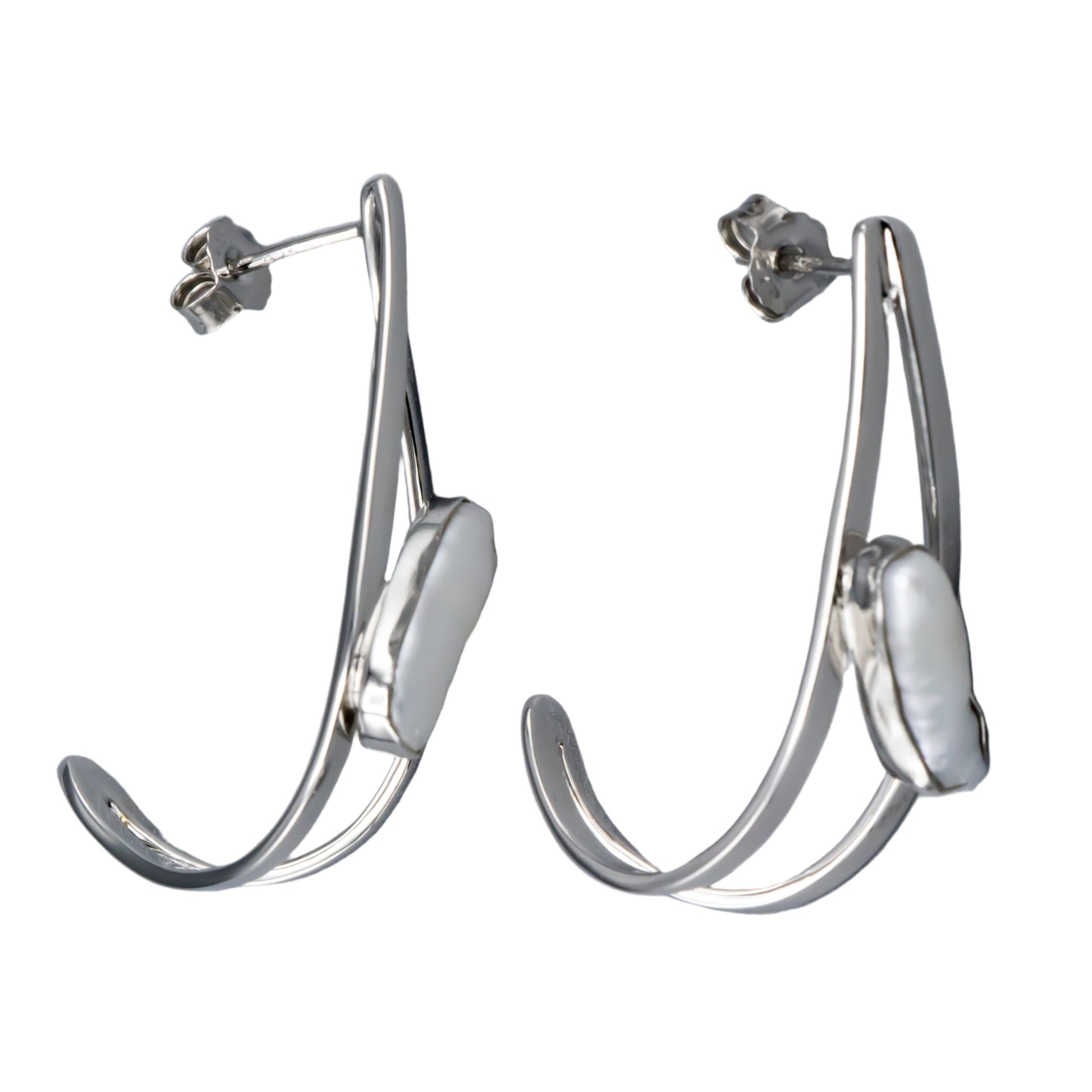 Sterling silver earrings featuring lustrous white baroque freshwater cultured pearls suspended from delicate post and hook findings. A refined choice for those who appreciate the organic beauty and timeless elegance of pearl jewelry.