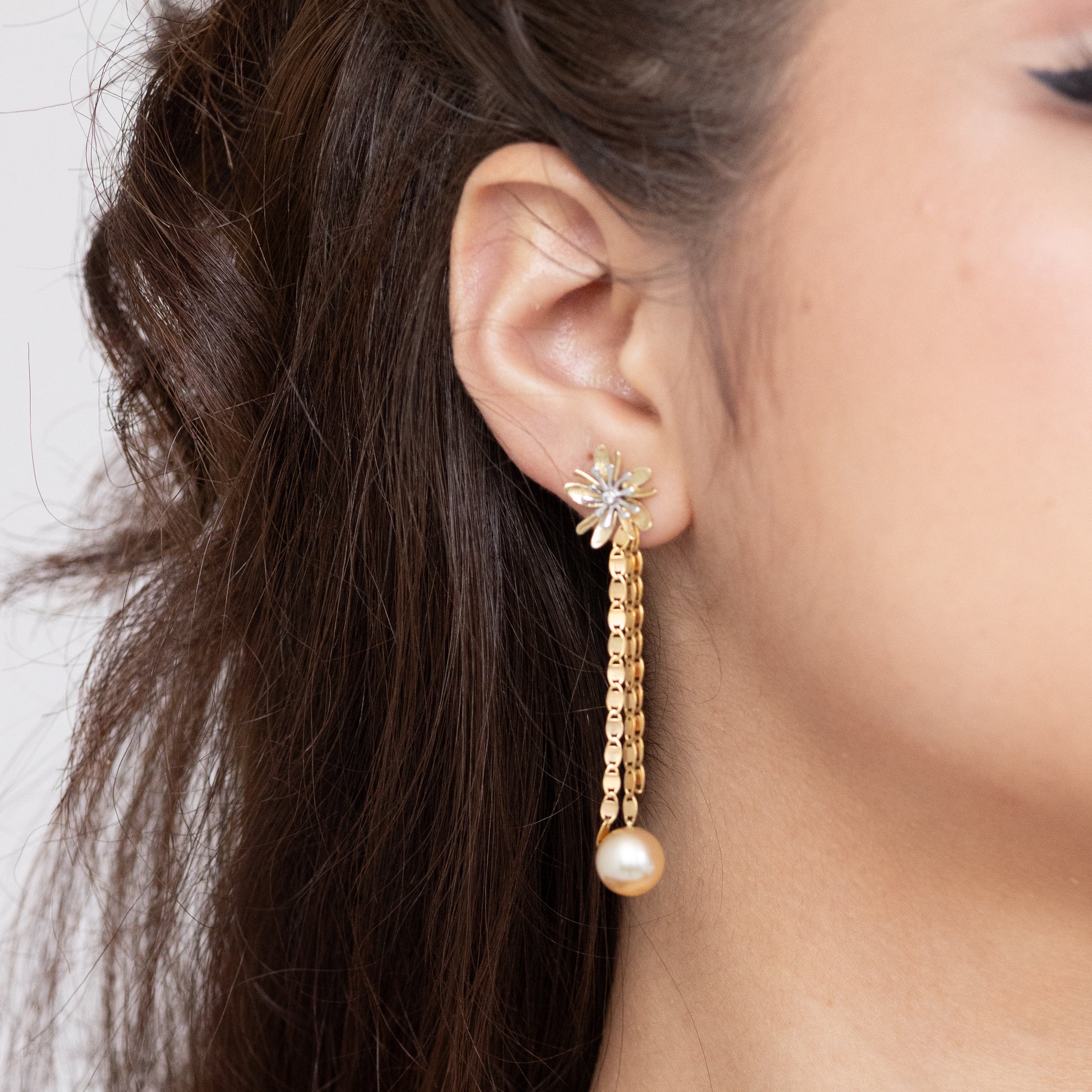Elegant flower studs crafted in 14K yellow and white gold, paired with matching 14K yellow gold jackets designed for versatile styling. Each dangle jacket showcases a lustrous 9.5mm golden South Sea cultured pearl, delivering timeless sophistication and refined luxury for the discerning wearer.