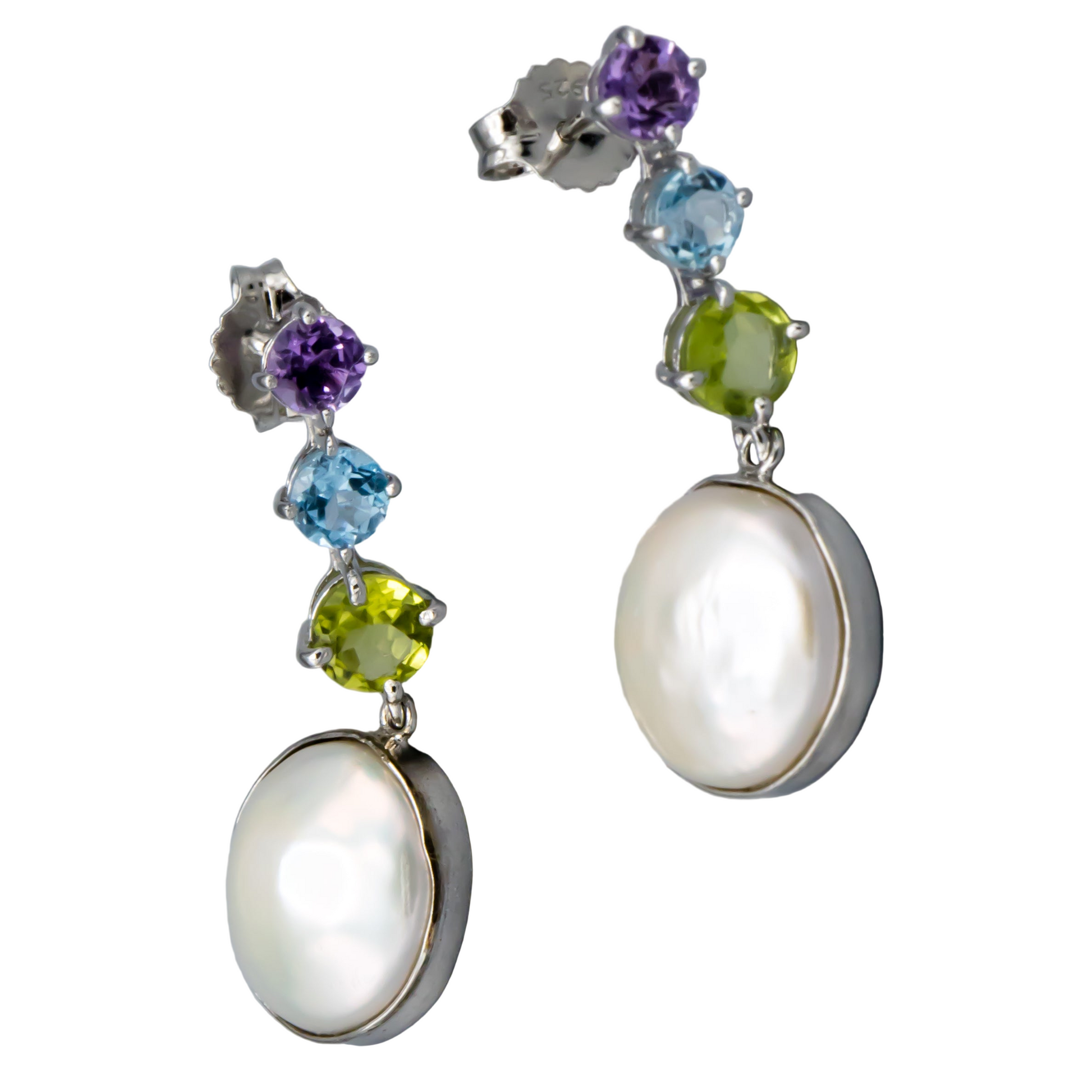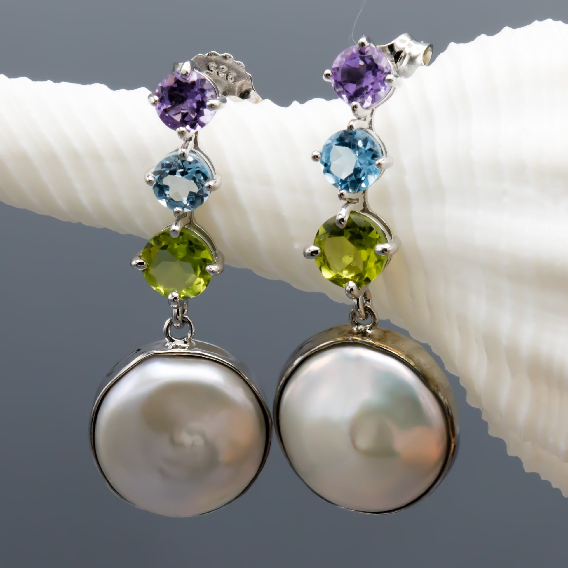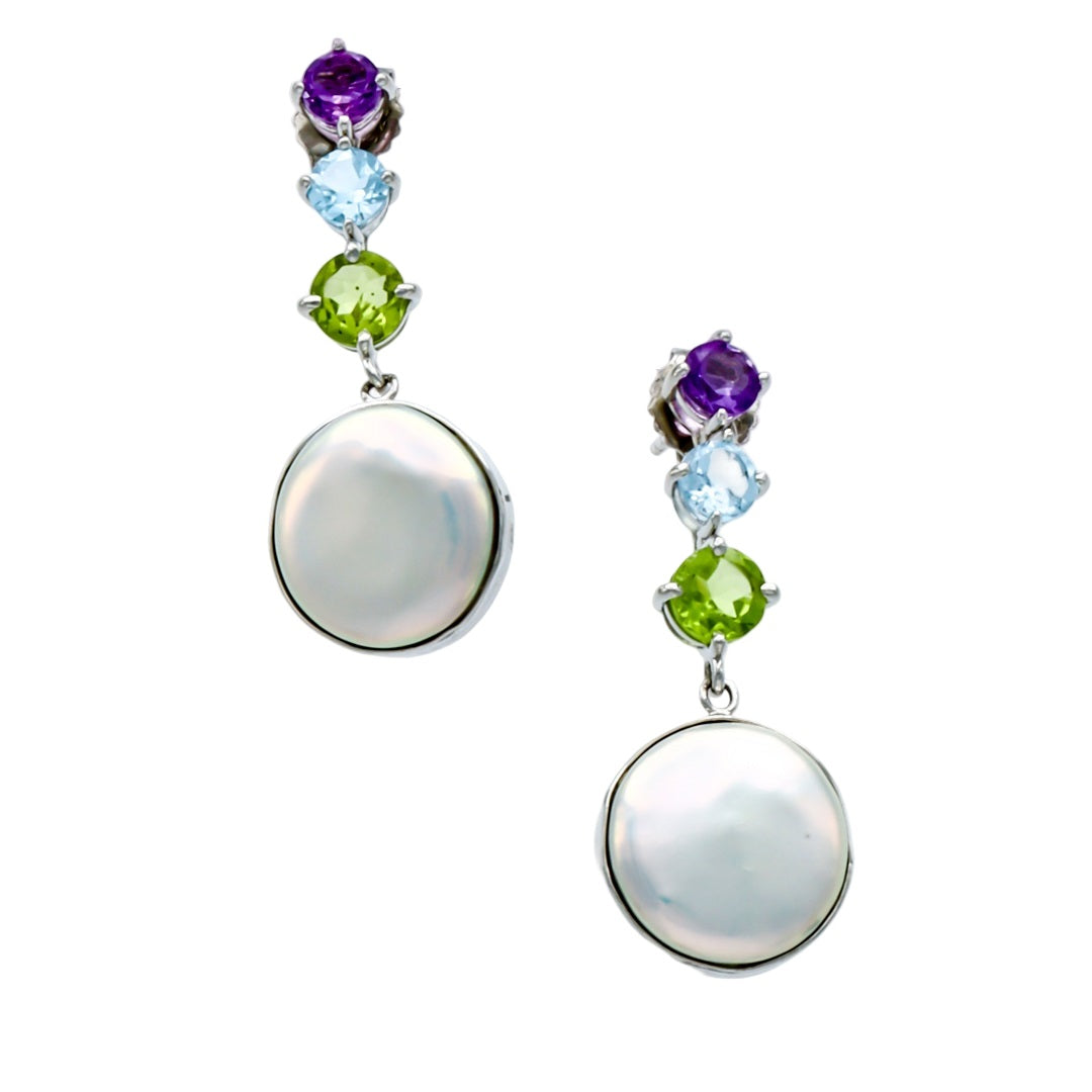 Elevate your elegance with these sterling silver post dangle earrings featuring lustrous white coin freshwater cultured pearls. Accentuated by shimmering amethyst, topaz, and peridot stones, they offer a refined blend of color and sophistication, perfect for adding a subtle yet striking touch to any ensemble.