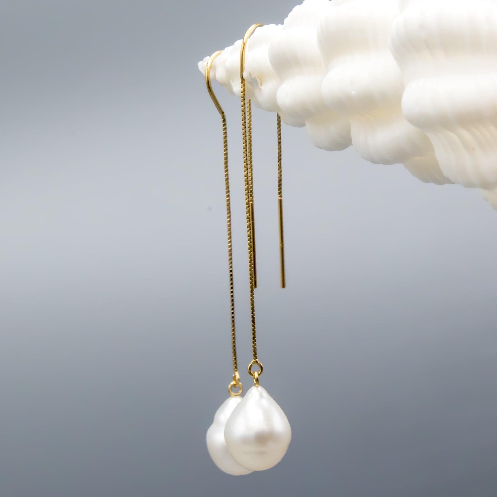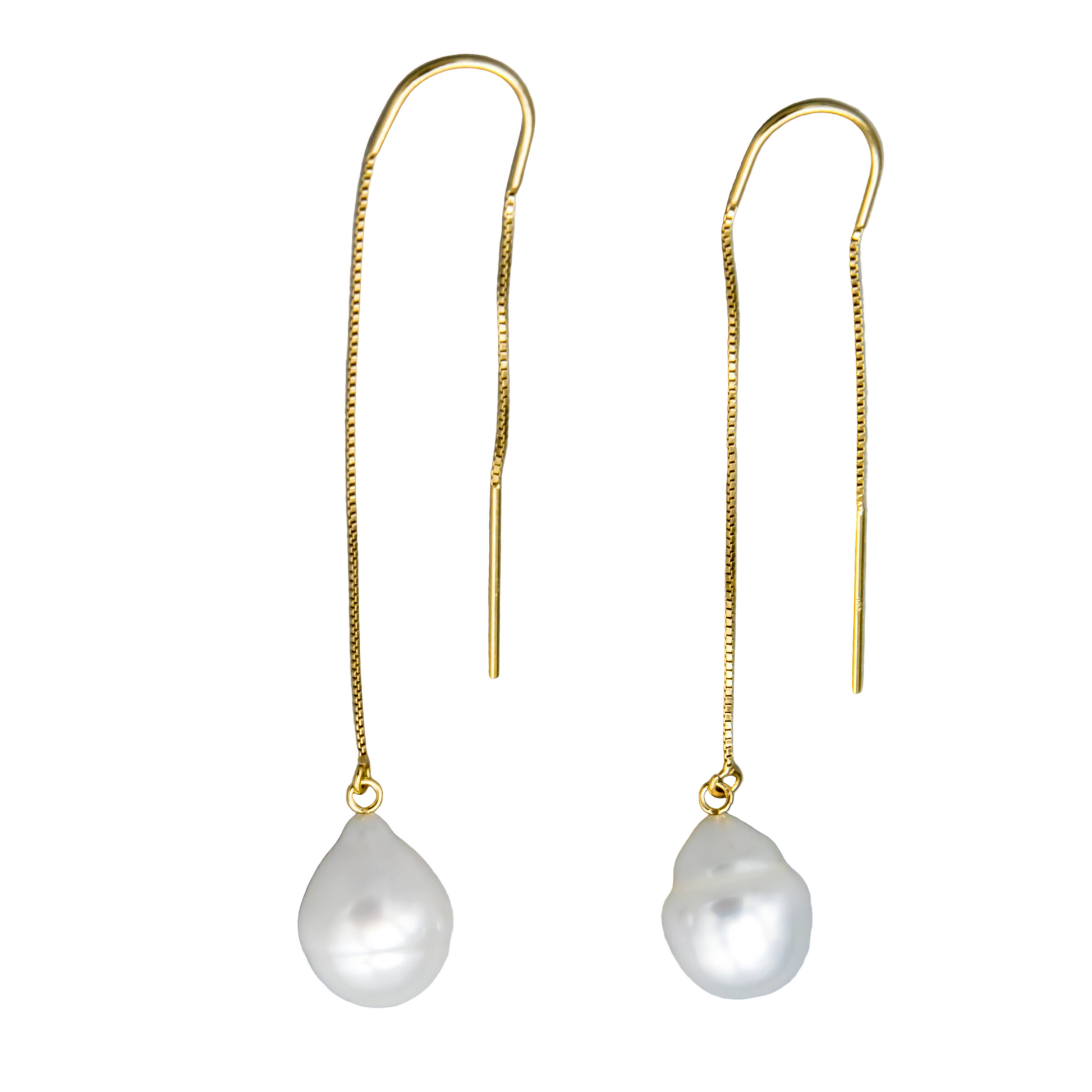 Elegant baroque white South Sea cultured pearls suspended from delicate 14K yellow gold threader earrings. These sophisticated dangles showcase the natural luster and organic beauty of saltwater pearls, sized at 9-9.5mm for understated refinement. Perfect for those who appreciate timeless pearl jewelry with contemporary styling.