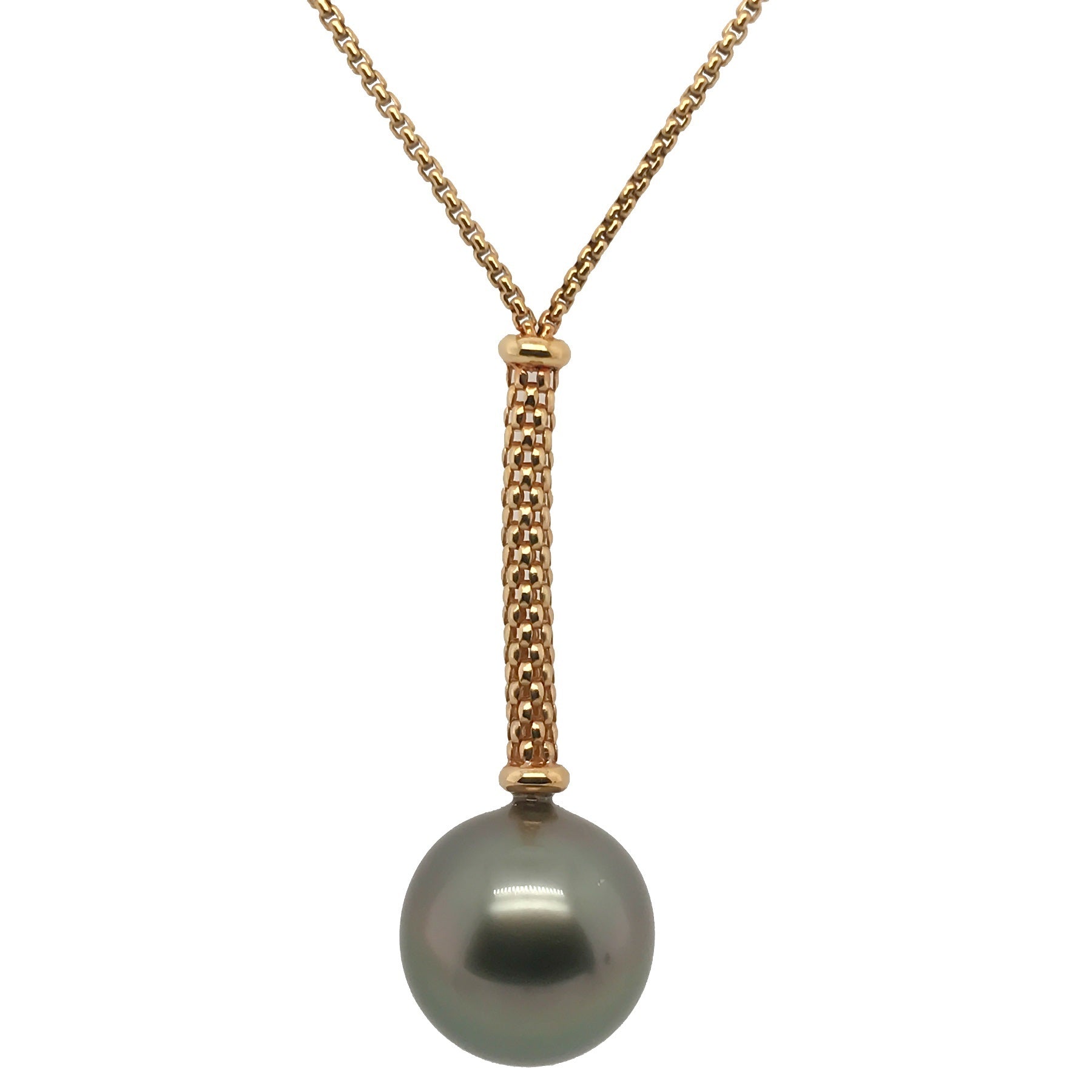 Elevate your elegance with this 14mm AAAA Tahitian saltwater cultured pearl, renowned for its deep luster and unique dark hues. Suspended from a 17-inch 18k yellow gold chain secured by a lobster clasp, this piece combines timeless sophistication with secure wearability. Ideal for refined occasions, it adds a distinctive touch of luxury to any ensemble.