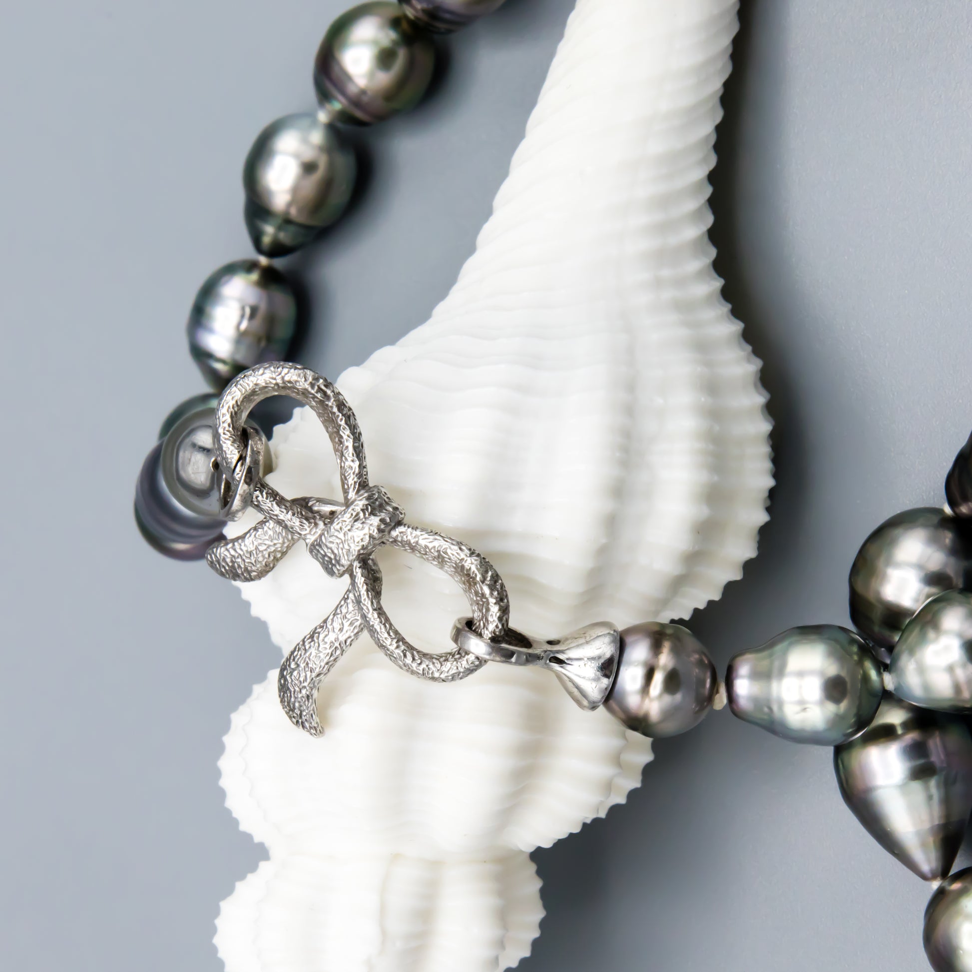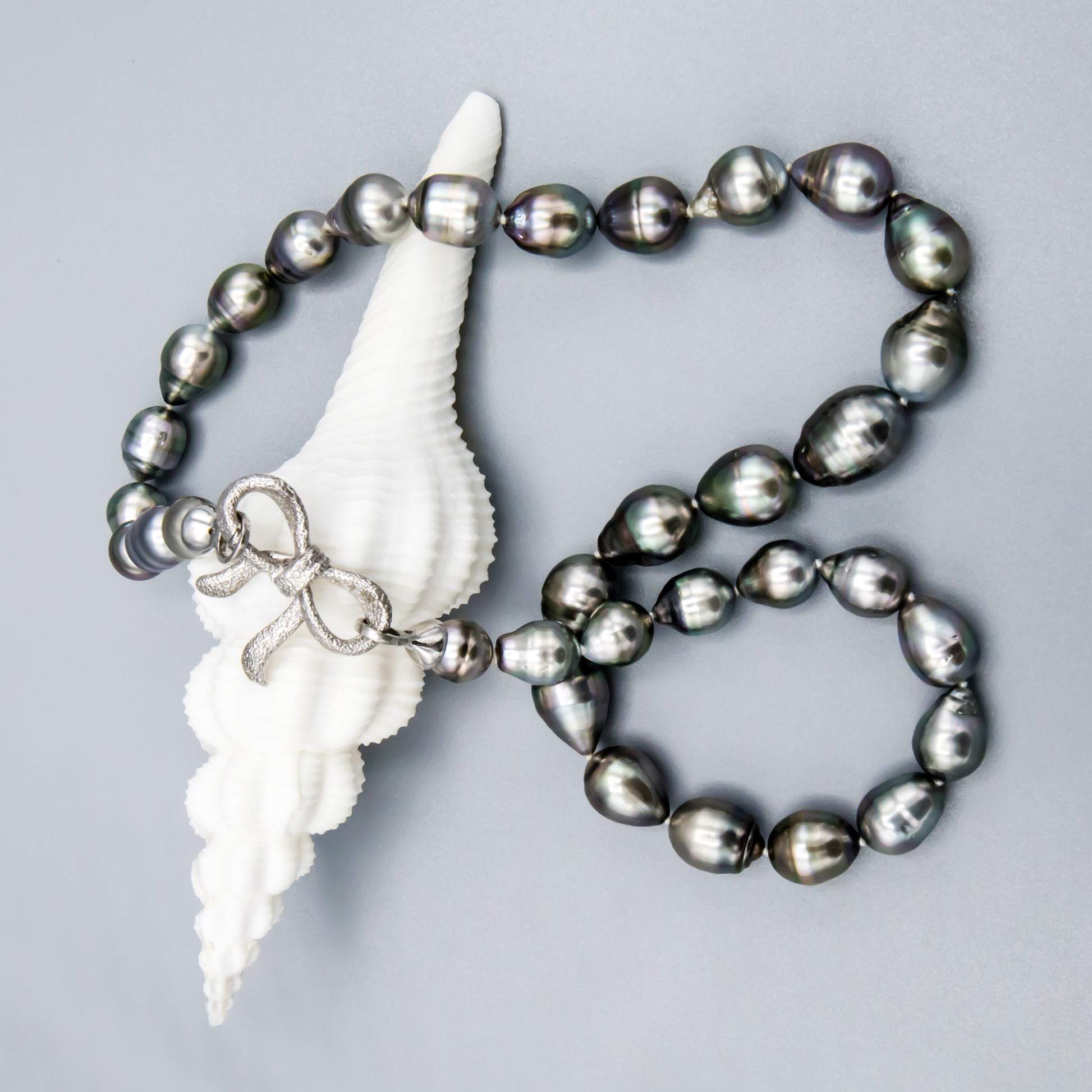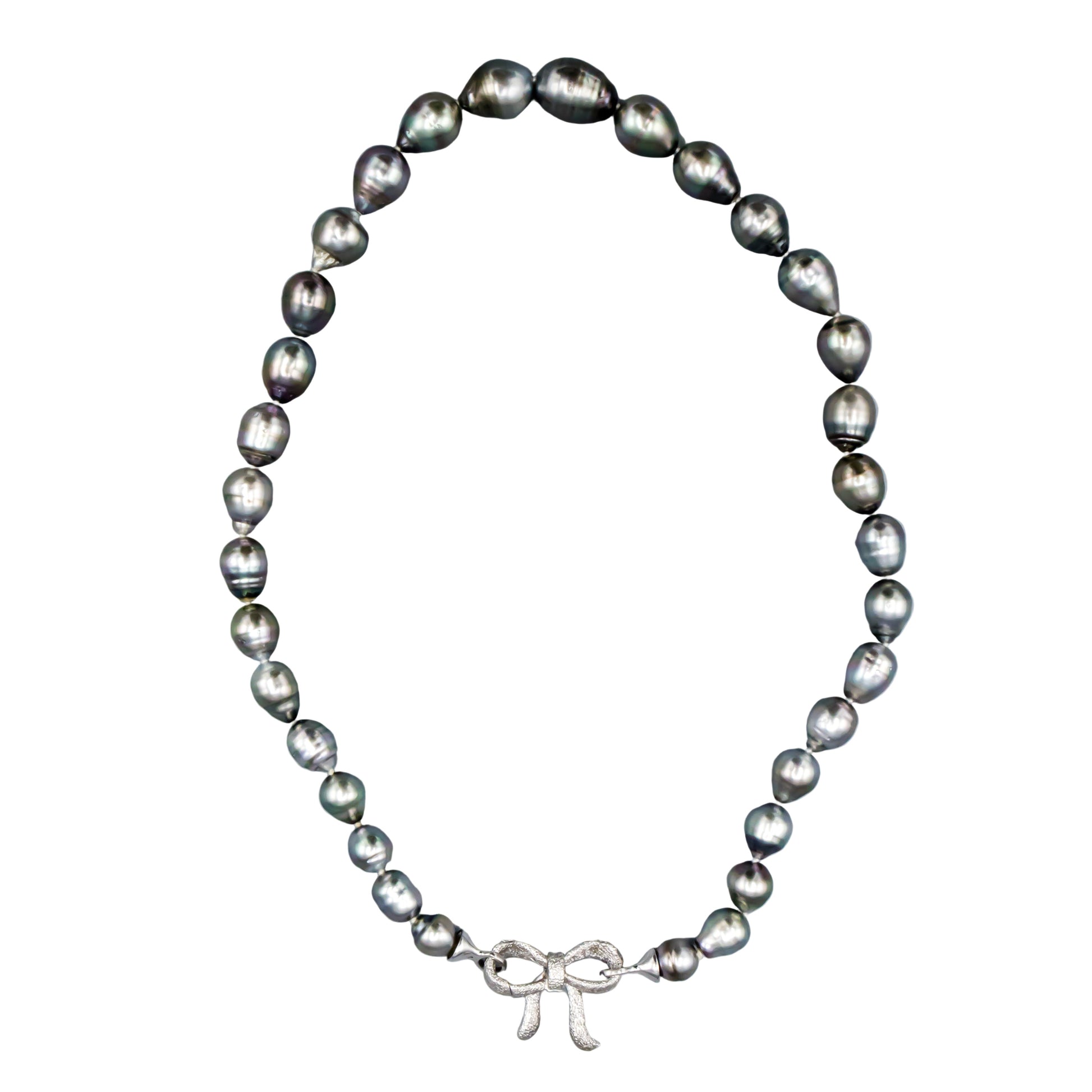 Elevate your elegance with this 18-inch strand of 8-12mm baroque teardrop Tahitian saltwater pearls. Each uniquely shaped pearl showcases natural luster and depth, while the sterling silver bow clasp adds a refined finishing touch. Designed for ease and style, simply pinch the spring-loaded clasp to undo it and release it to secure your necklace with confidence. Perfectly sophisticated for any occasion.
