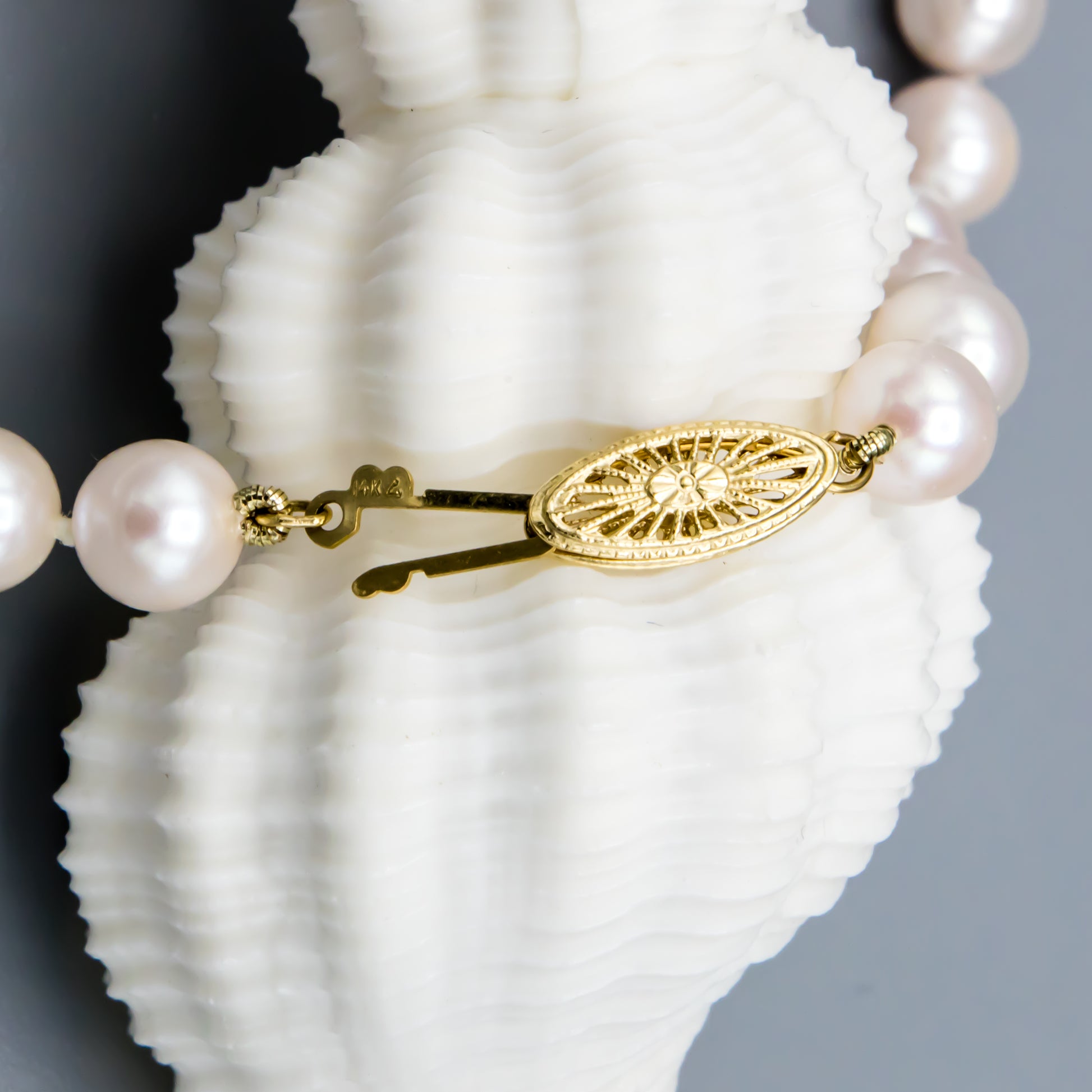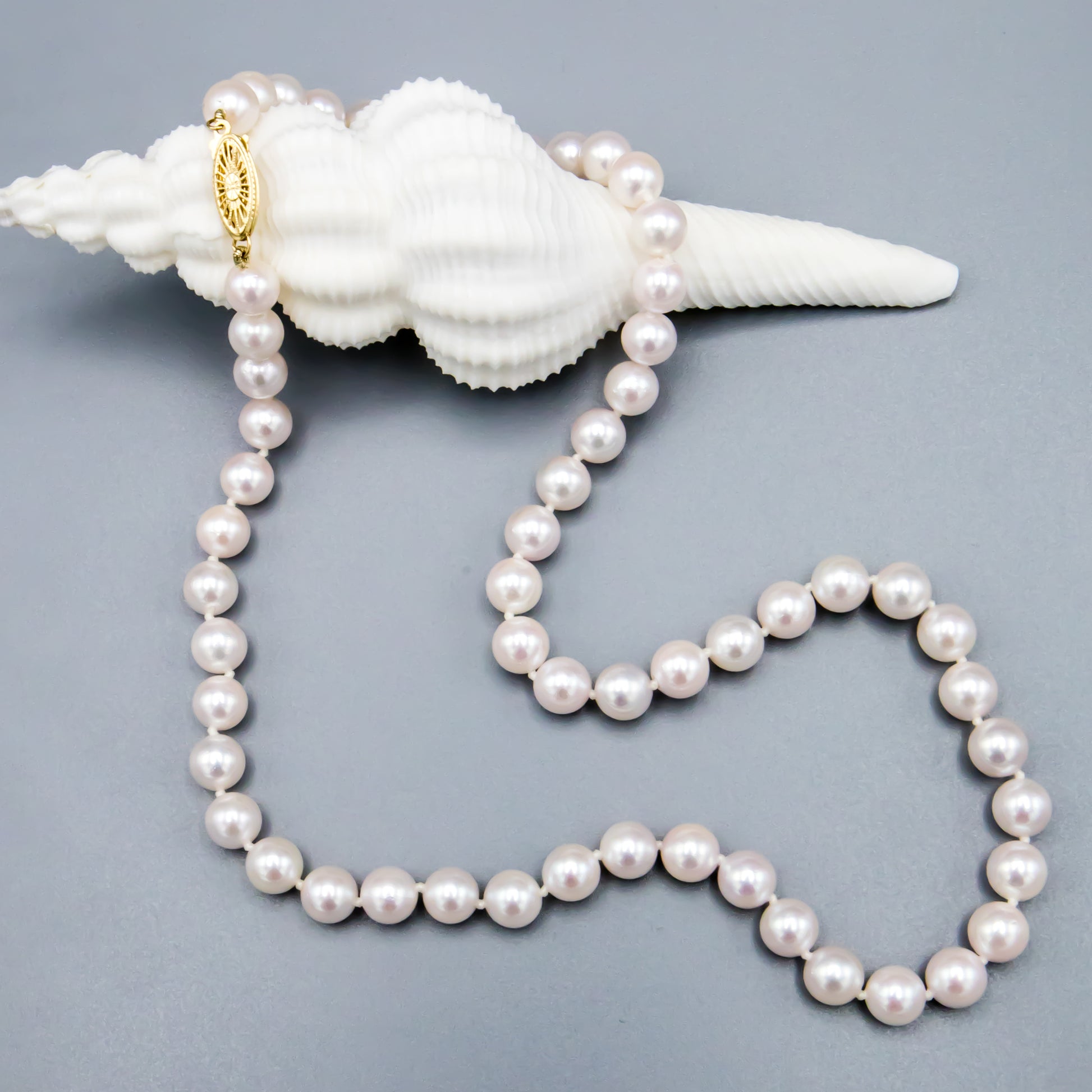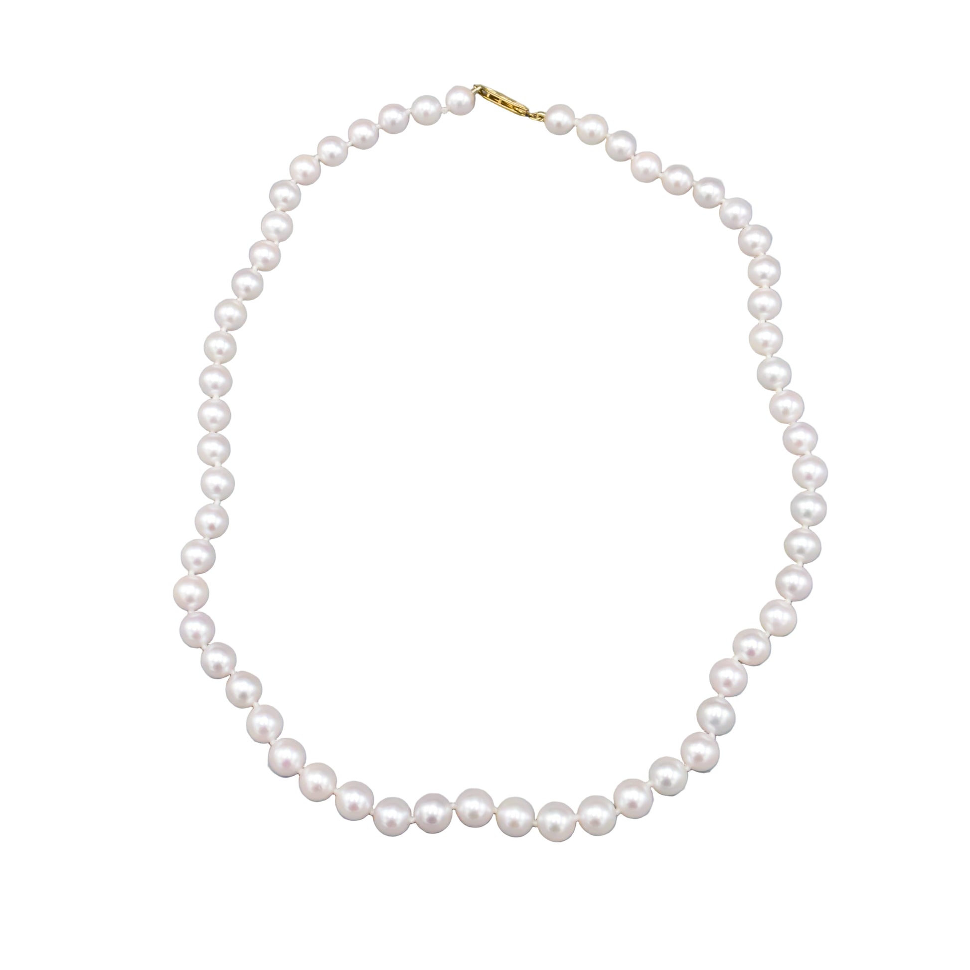 Elevate your jewelry collection with this refined 18-inch Akoya pearl necklace, featuring lustrous 7-7.5mm Japanese cultured pearls renowned for their exceptional luster and subtle iridescence. The single strand design showcases the natural beauty of each pearl, while the secure 14K yellow gold clasp adds timeless elegance and lasting durability. Perfect for both everyday sophistication and special occasions, this piece embodies the classic allure of authentic saltwater pearls.