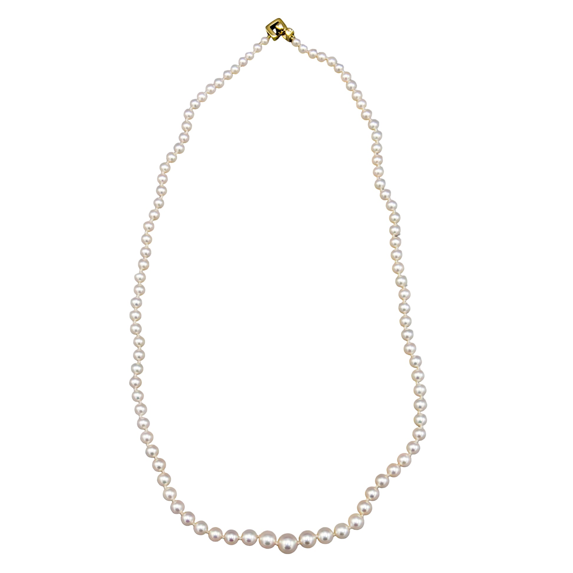 The graduated pearl strand is one of the most artistically refined designs in fine jewelry. This 19.5-inch necklace features Japanese Akoya cultured pearls ranging from 3.5mm at the sides to 7mm at the center, creating a graceful visual flow that draws the eye and flatters the neckline beautifully.