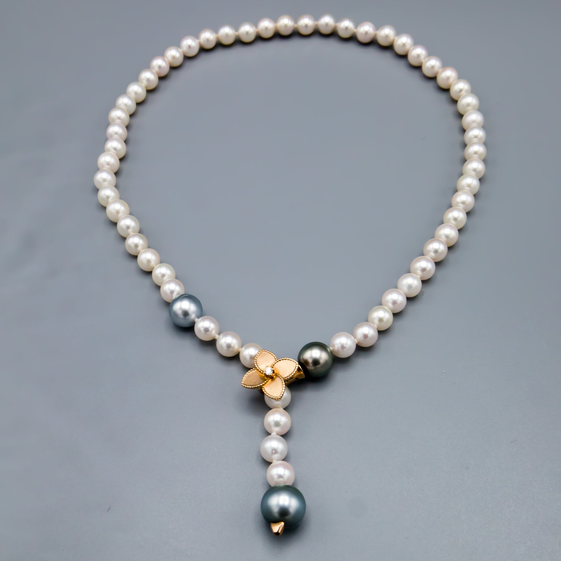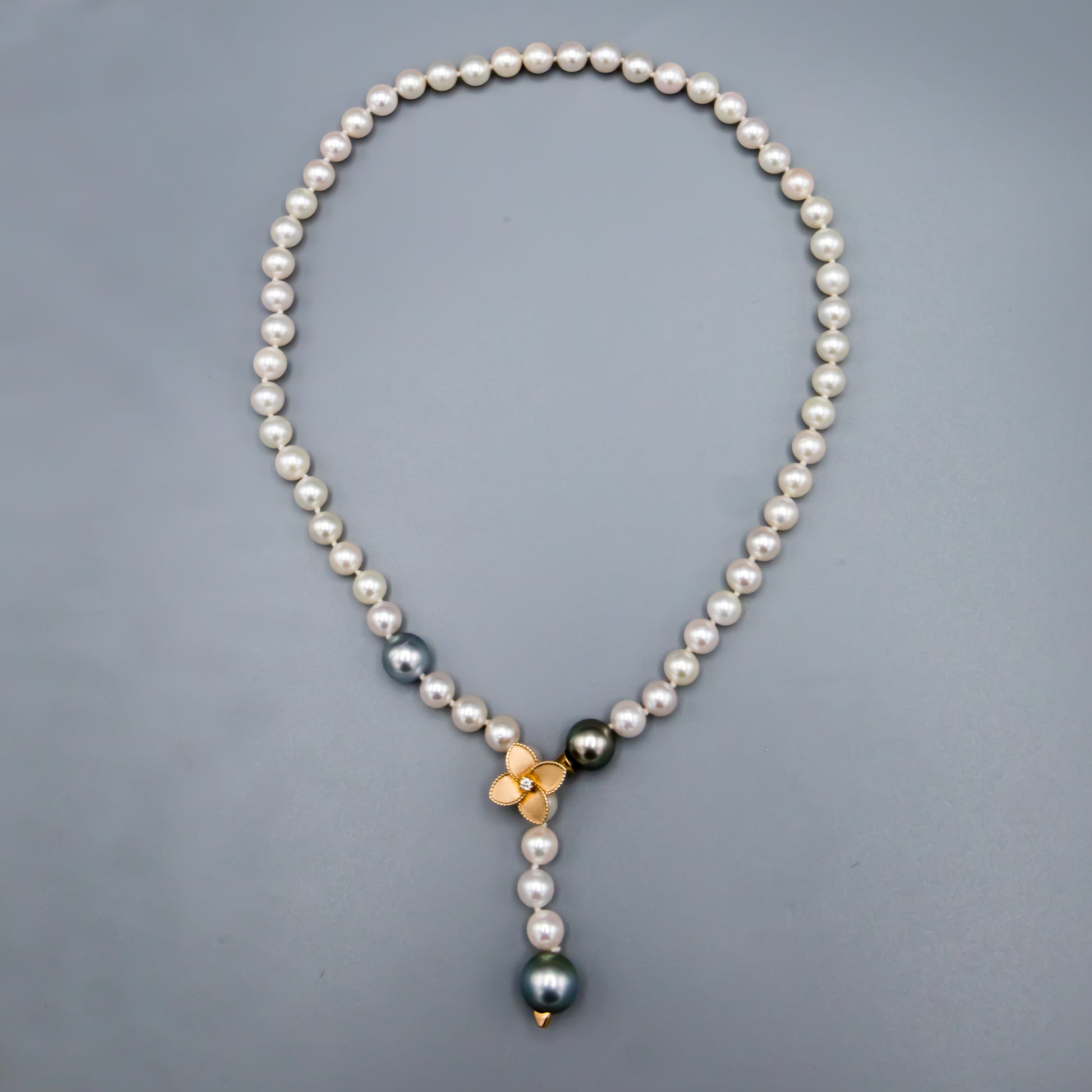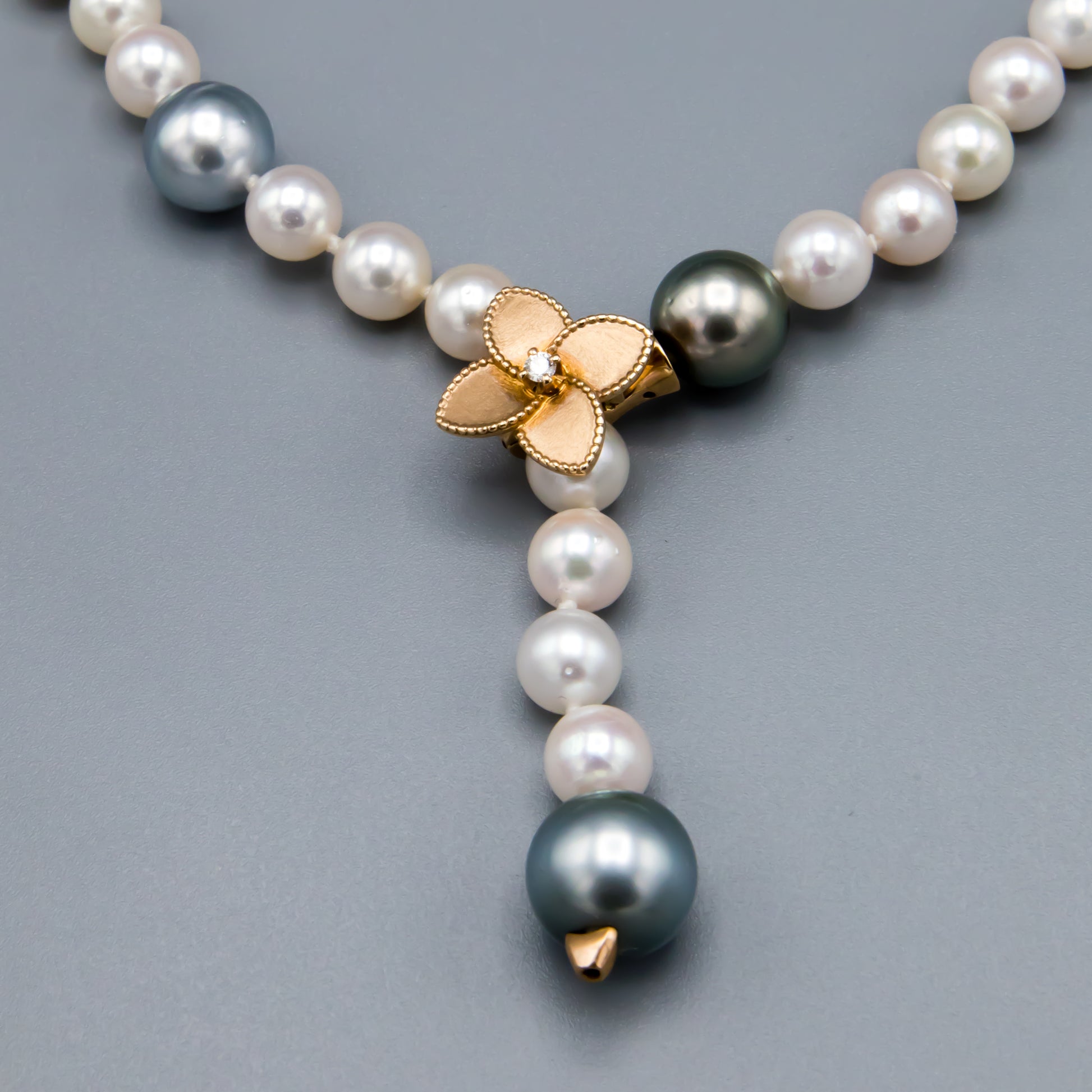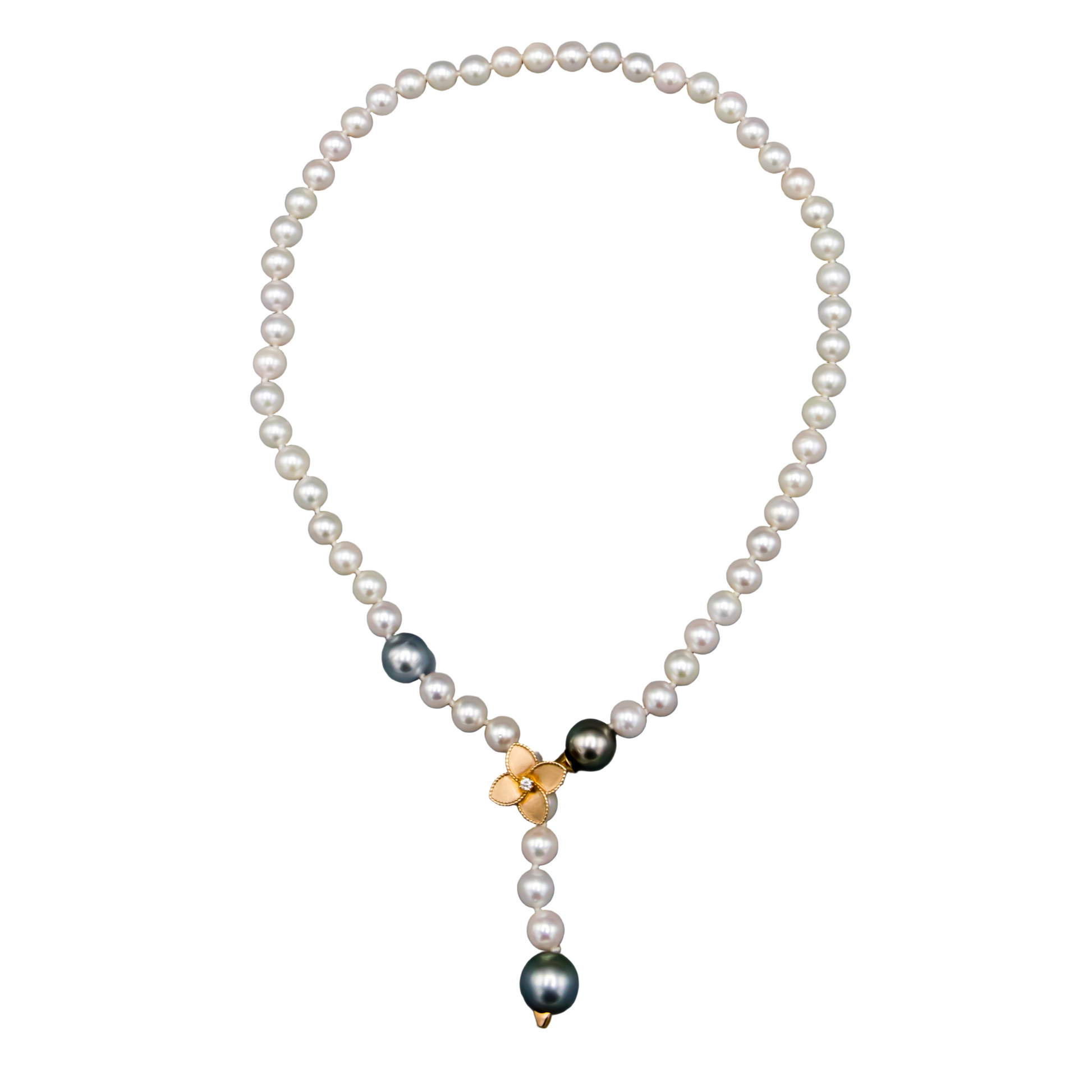 Indulge in luxury with this necklace. Adorned with 19 inches of stunning 7-7.5mm Japanese Akoya saltwater cultured pearls, three 9.7mm-10.9mm Tahitian saltwater cultured pearls, and featuring a delicate 14K Rose Gold flower with a sparkling diamond inlay, this piece is a true masterpiece. Elevate your style and embrace the exclusivity of this elegant necklace.