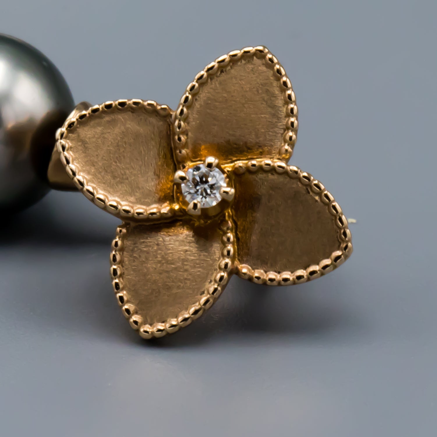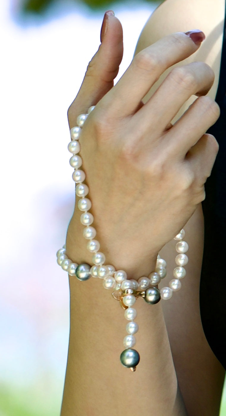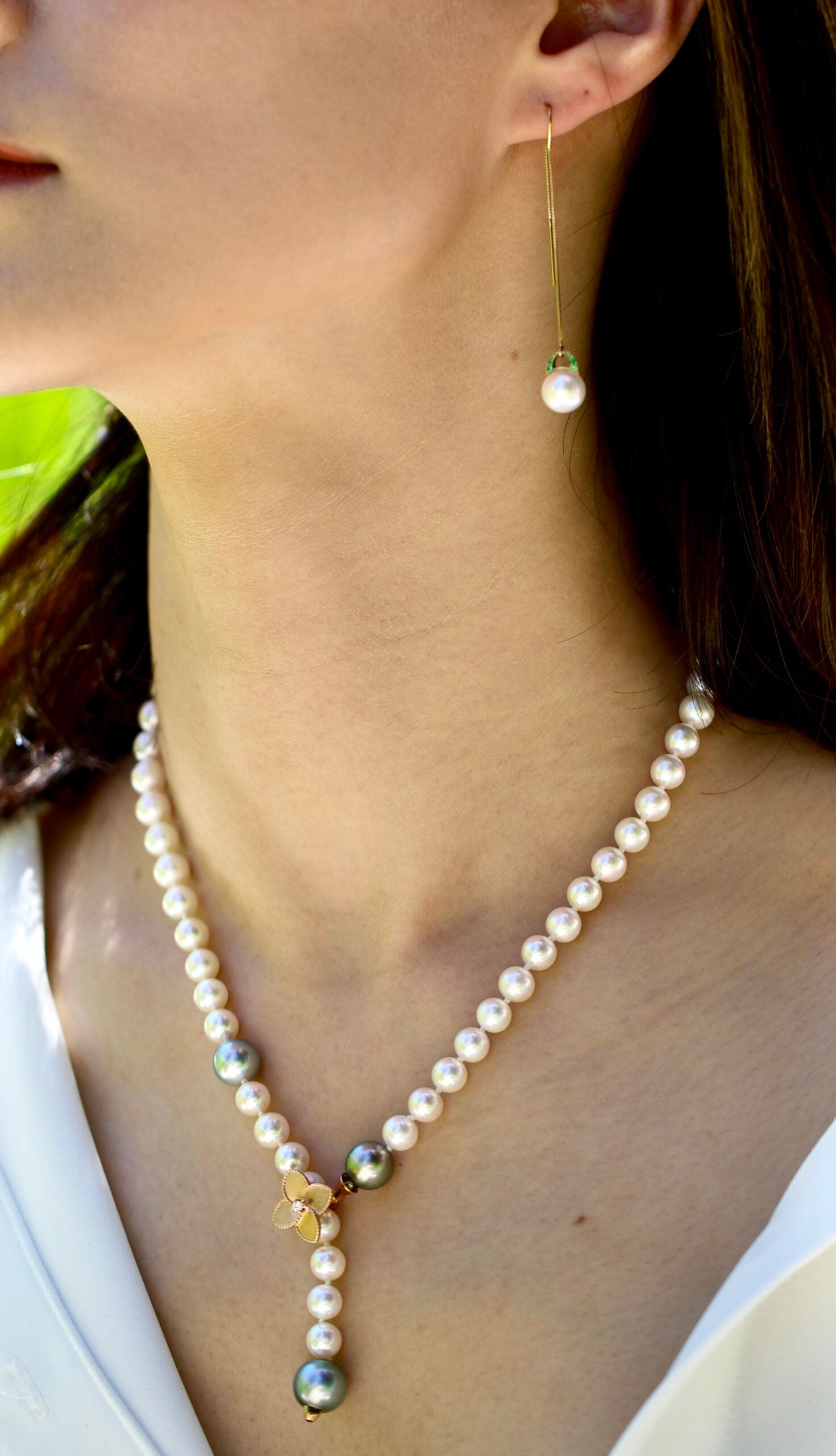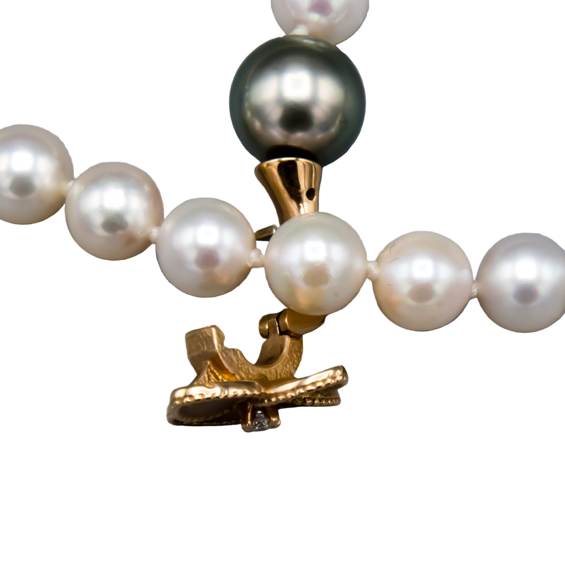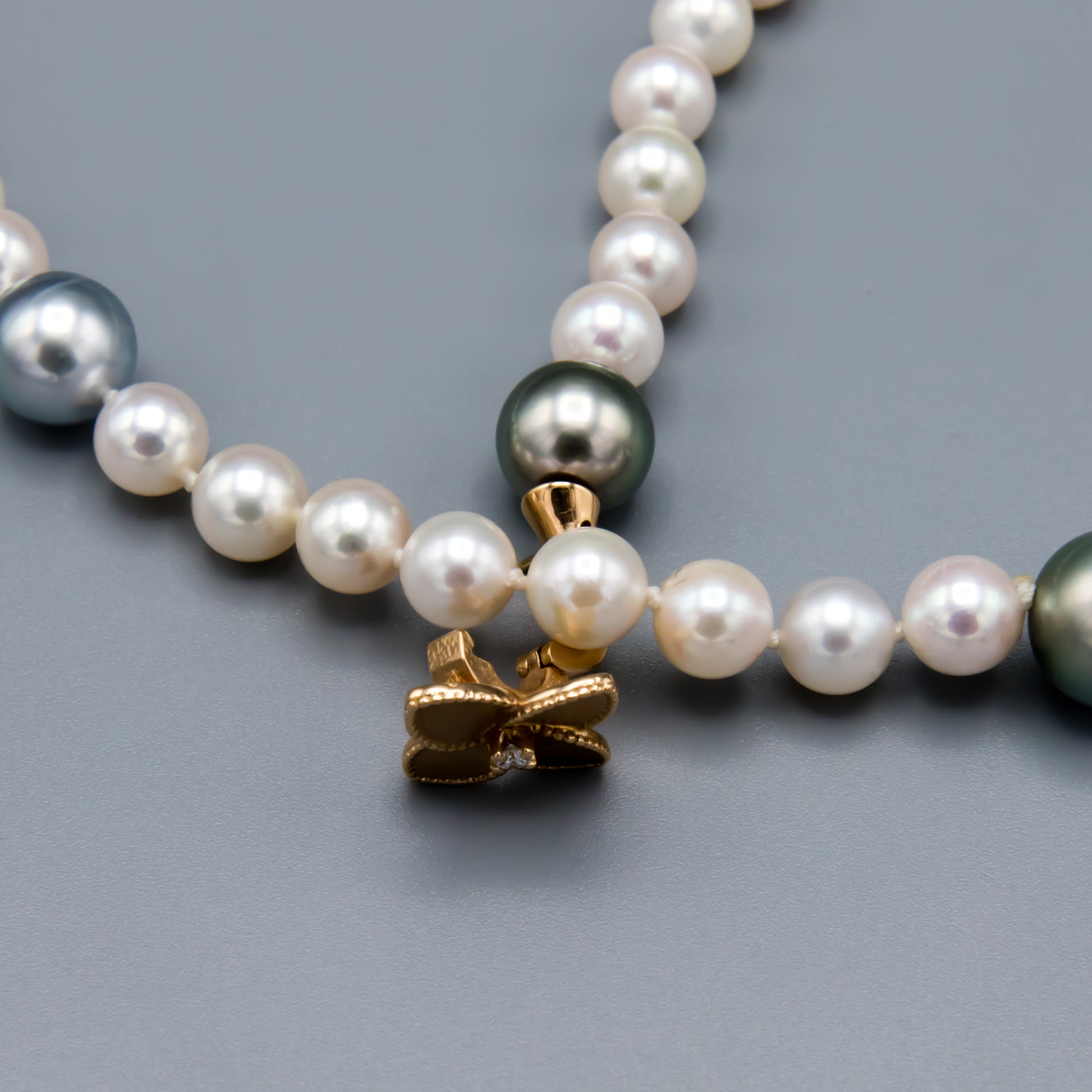 Indulge in luxury with this necklace. Adorned with 19 inches of stunning 7-7.5mm Japanese Akoya saltwater cultured pearls, three 9.7mm-10.9mm Tahitian saltwater cultured pearls, and featuring a delicate 14K Rose Gold flower with a sparkling diamond inlay, this piece is a true masterpiece. Elevate your style and embrace the exclusivity of this elegant necklace.