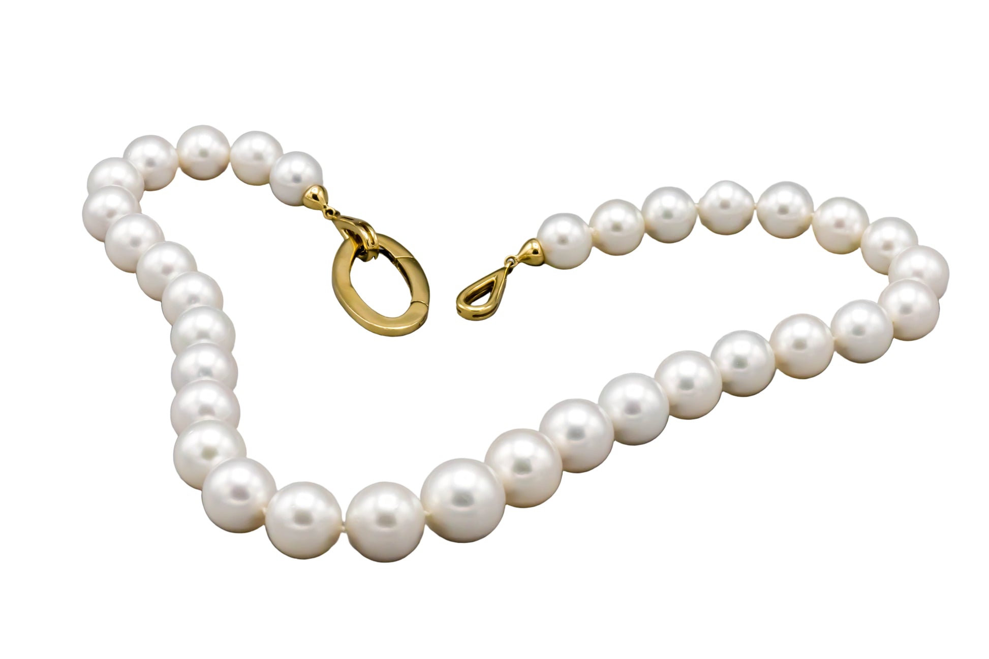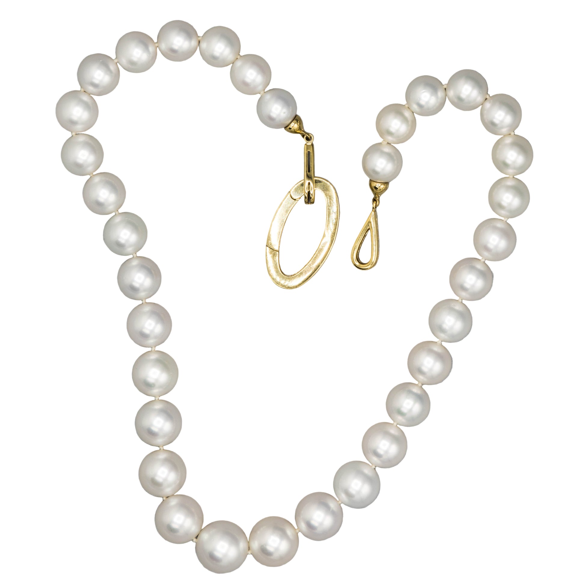 Elevate your jewelry collection with this exquisite 21-inch strand of Australian Southsea saltwater cultured pearls, showcasing the lustrous beauty these waters are renowned for. Each pearl measures 12-14.8mm, displaying the rich, warm tones characteristic of premium Southsea varieties. Secured with a refined 14k yellow gold clasp, this timeless piece transitions seamlessly from day to evening wear, offering both elegance and enduring quality for the discerning collector.