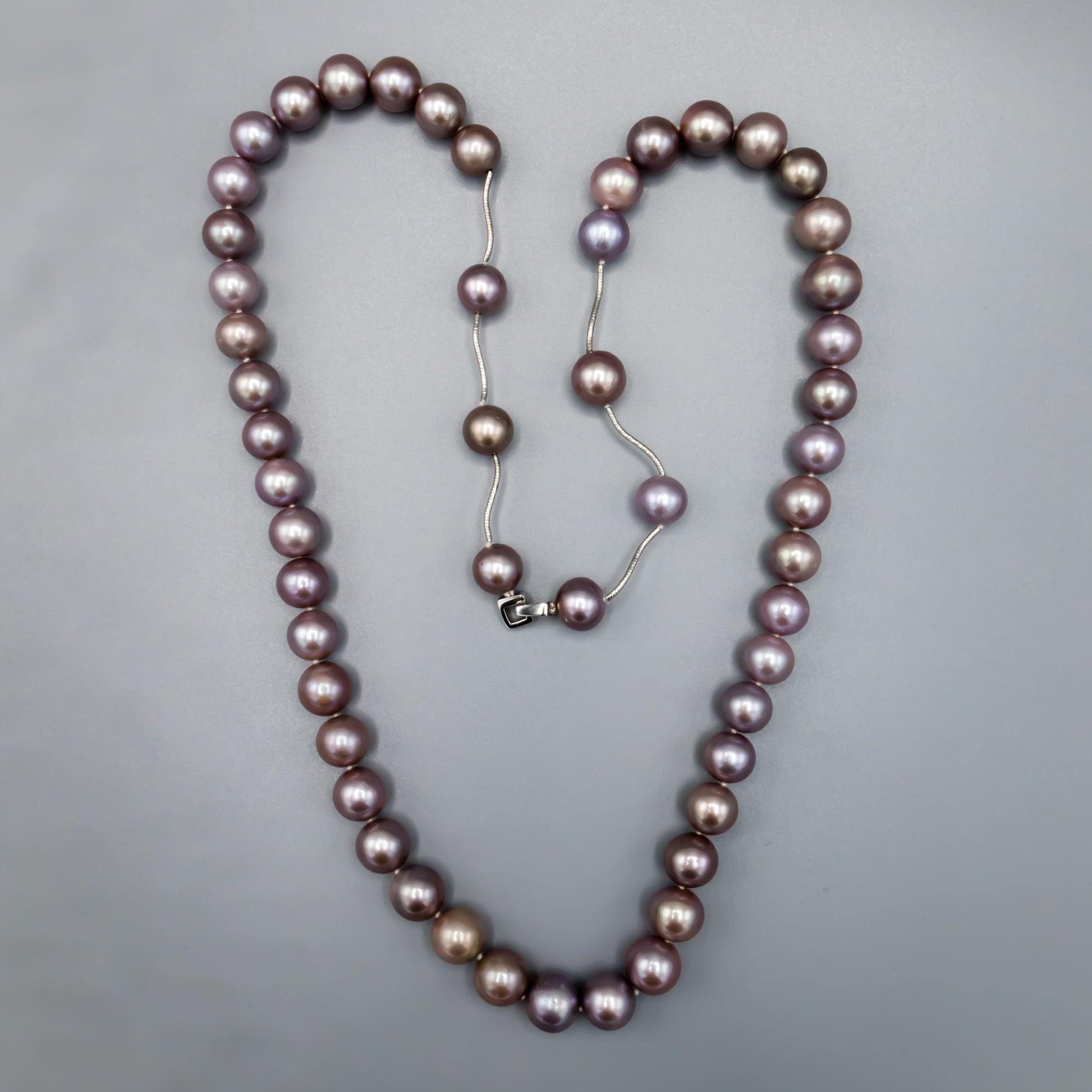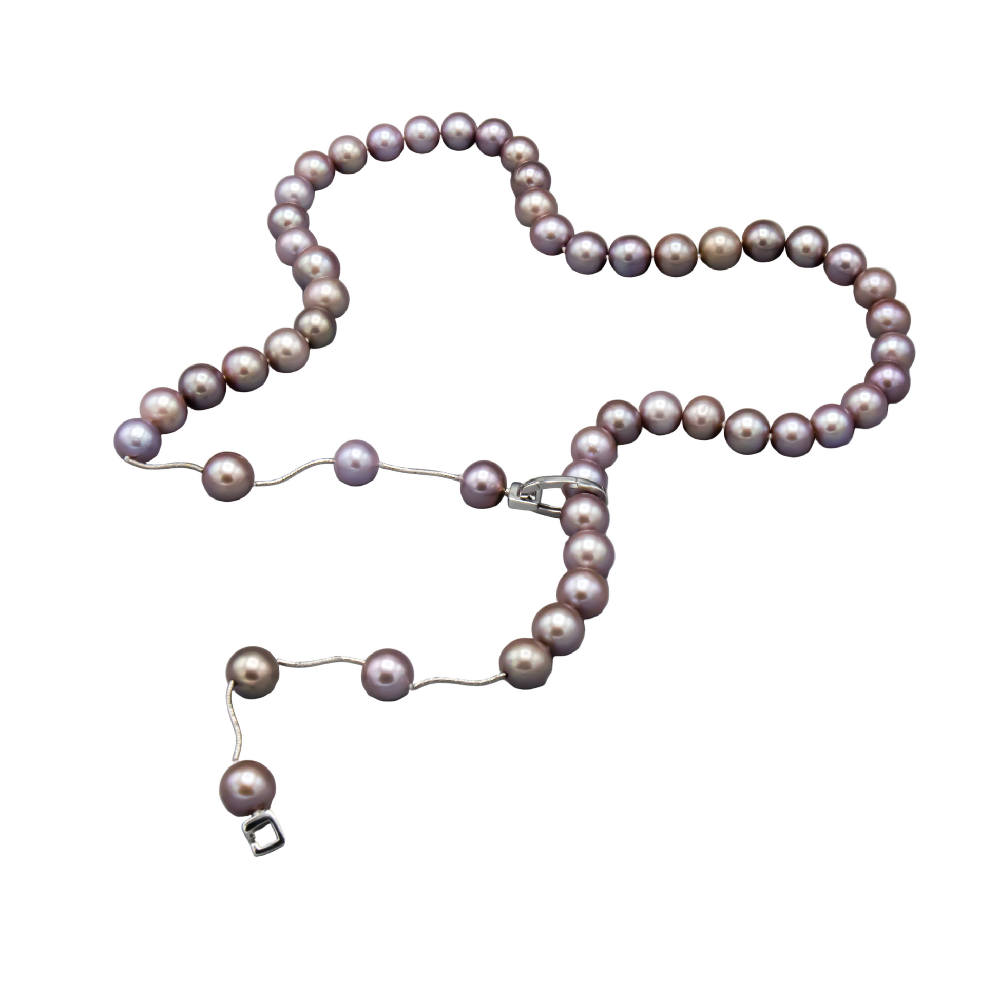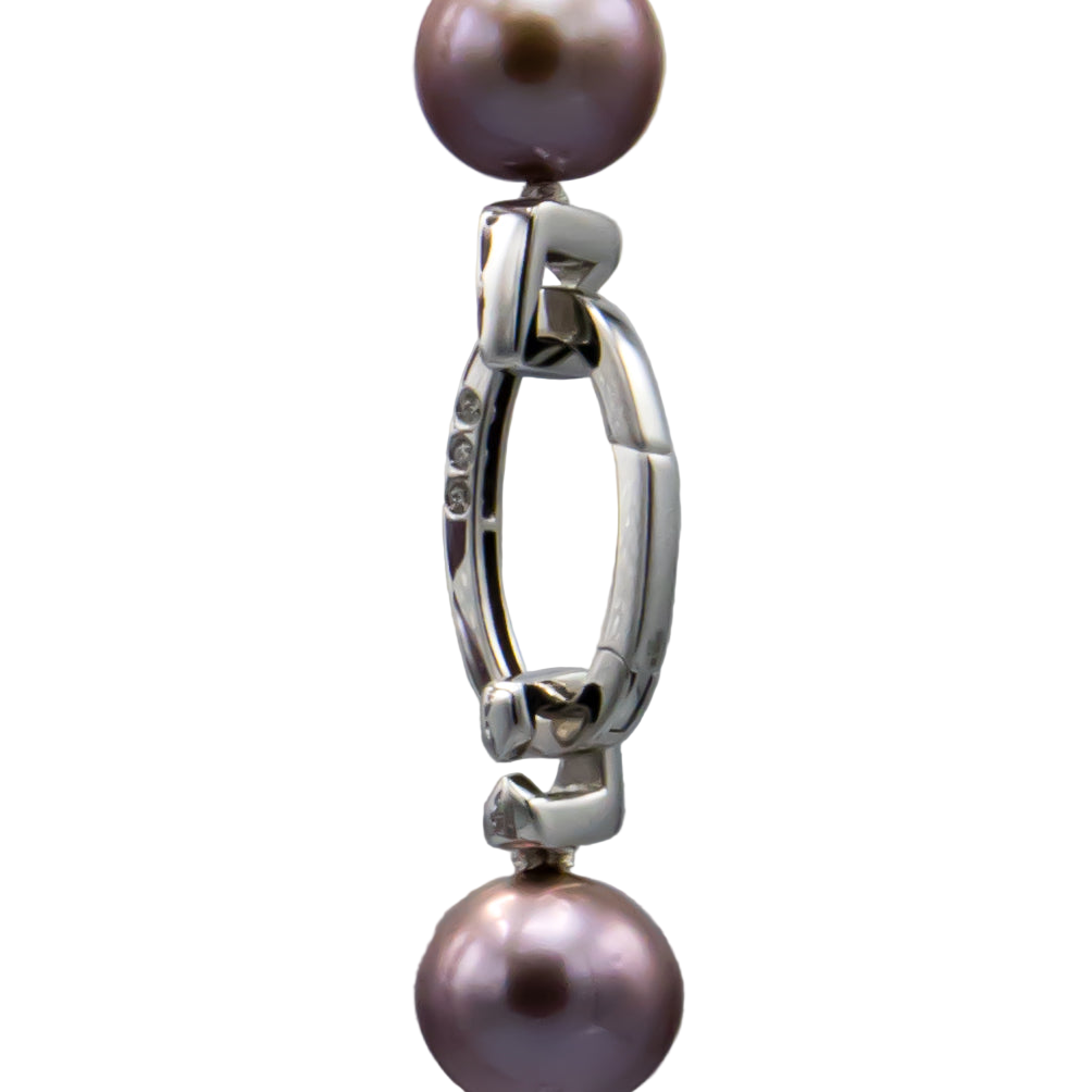 This elegant 27-inch necklace showcases lustrous freshwater cultured pearls in soft lavender, each measuring 10.5-11.5mm for a refined presence. Six intricately crafted 14K white gold spacers punctuate the strand, creating visual rhythm and sophistication. The piece concludes with an oval 14K white gold clasp adorned with three sparkling diamonds, adding a luxurious finishing touch. Perfect for everyday elegance or complementing special occasions, this timeless design balances classic pearl beauty with contemporary white gold accents.