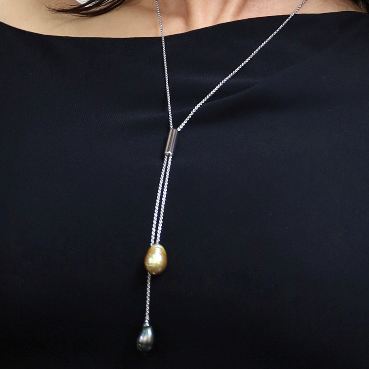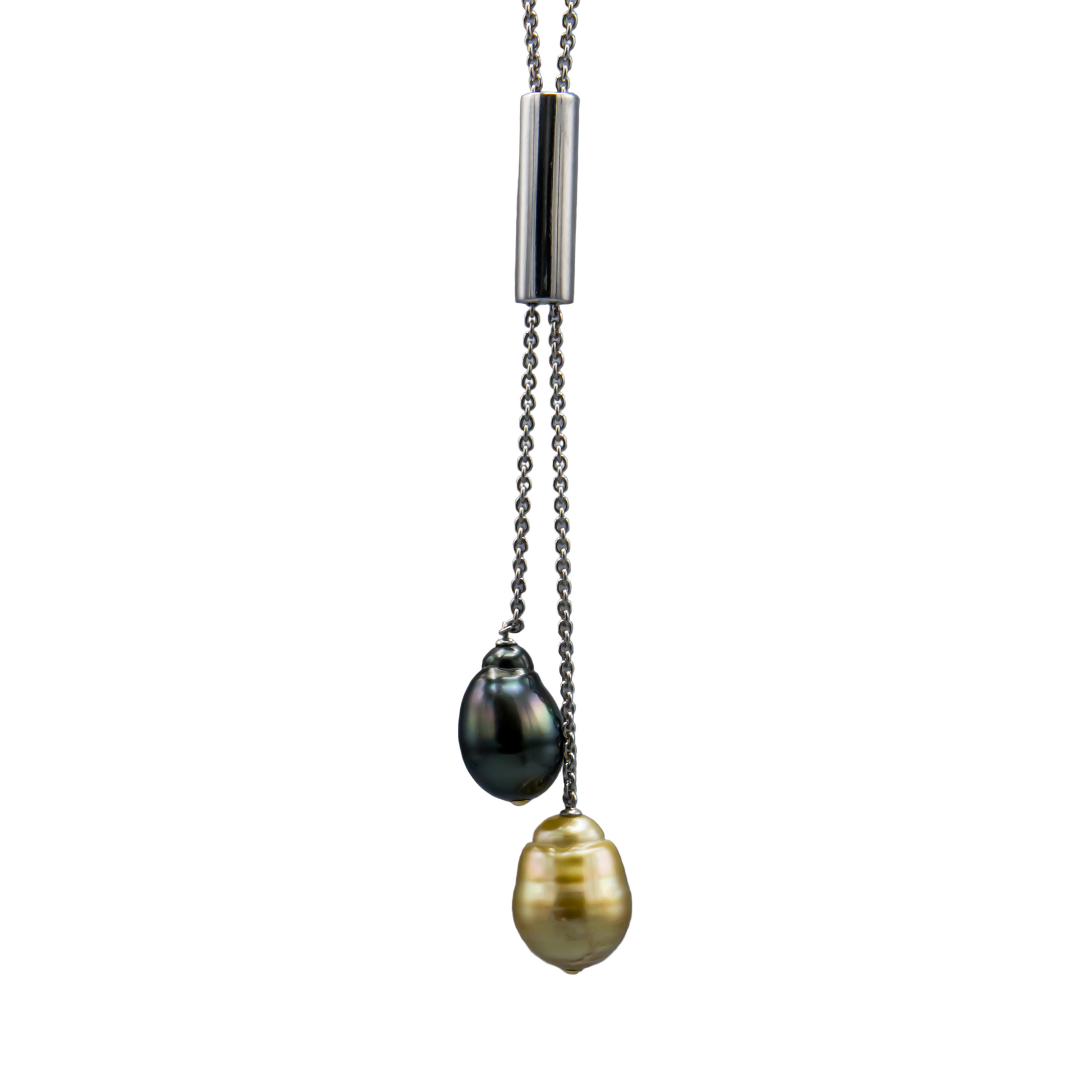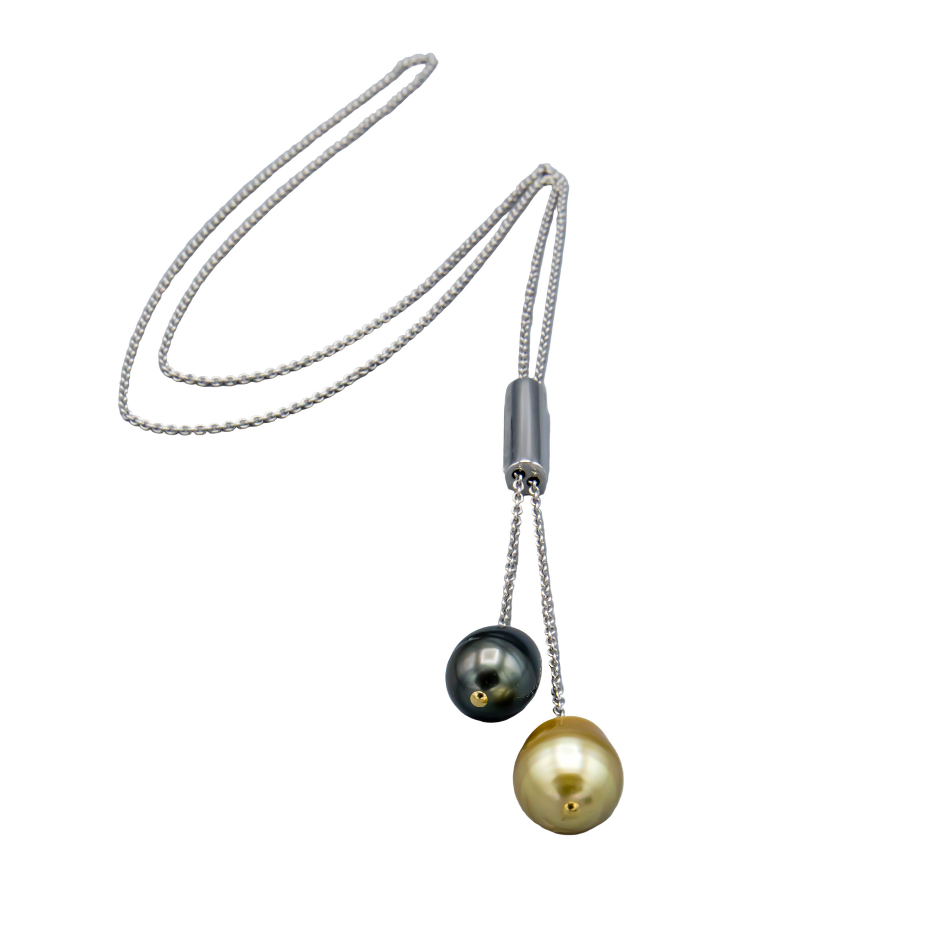 32-inch Sterling Silver double drop necklace with 2 saltwater cultured pearls, 1 Tahitian and 1 Southsea golden.