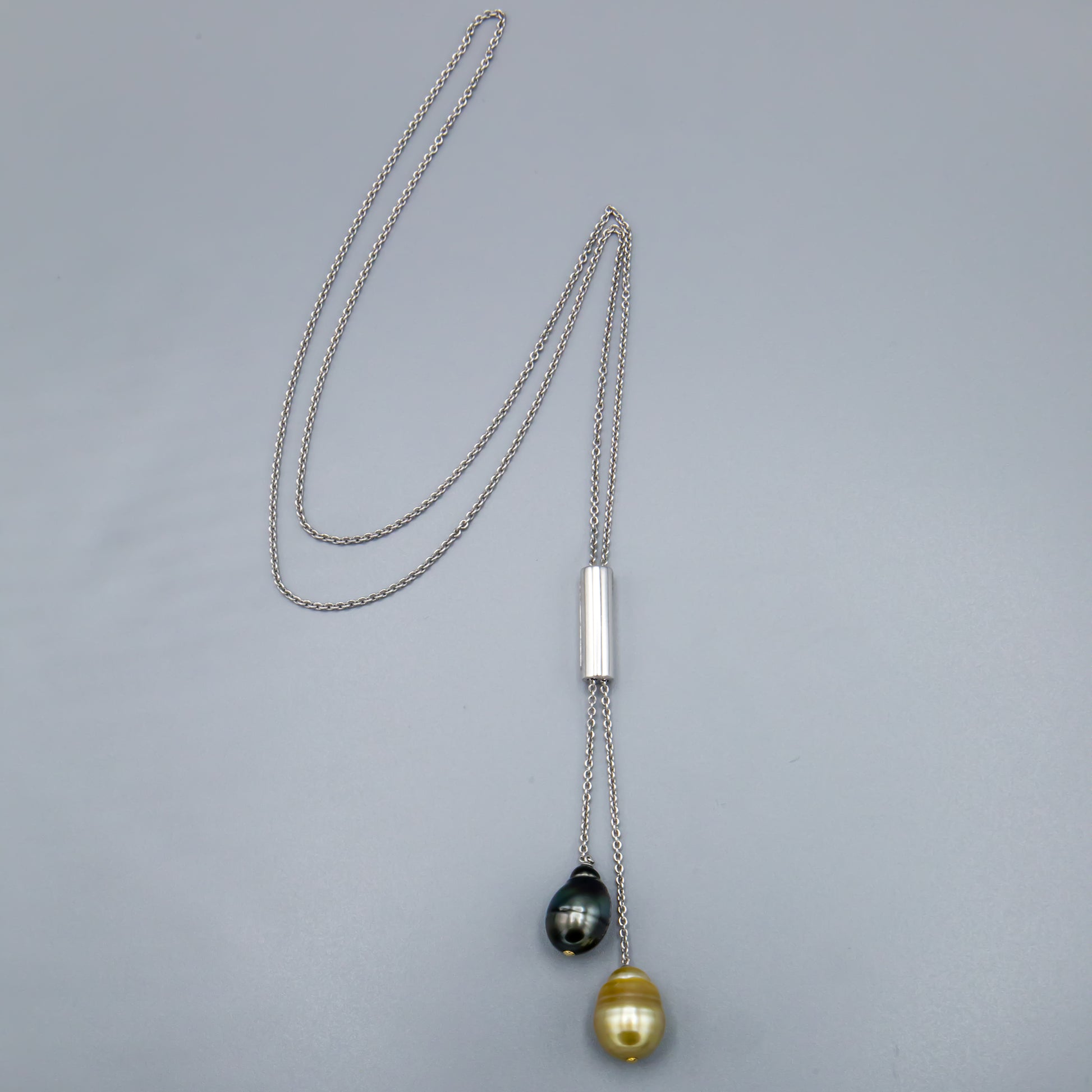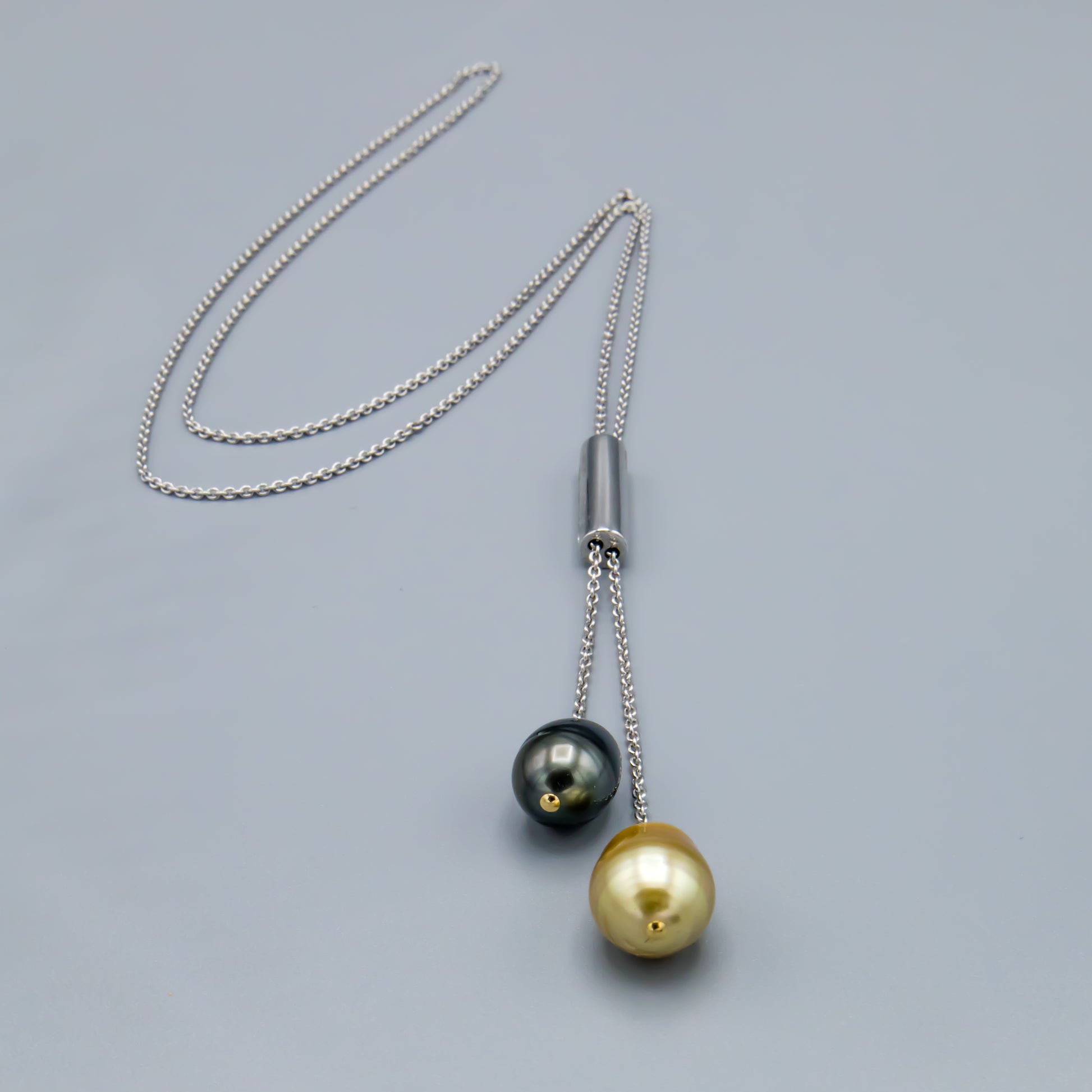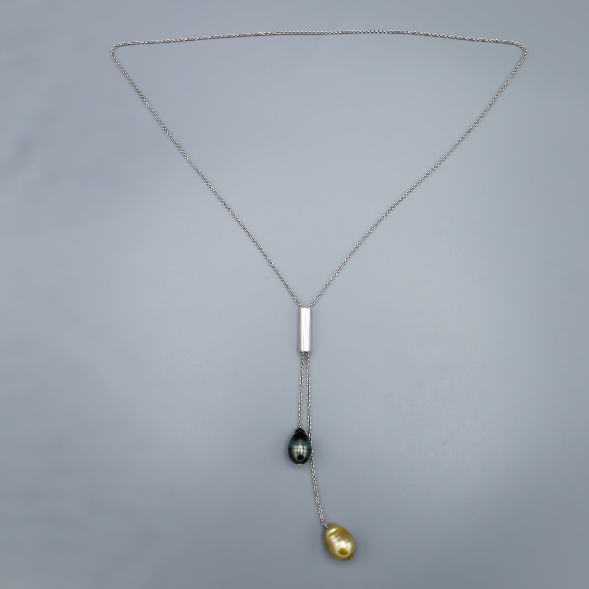 32-inch Sterling Silver double drop necklace with 2 saltwater cultured pearls, 1 Tahitian and 1 Southsea golden.