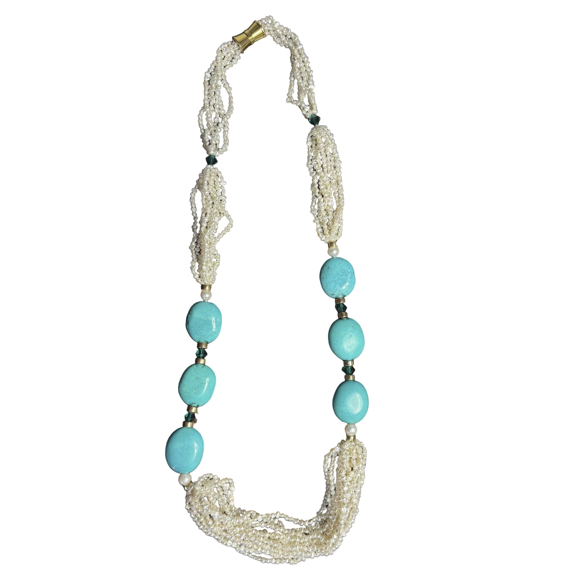 32-inch multiple strand white baroque freshwater pearl and imitation turquoise necklace with plated magnetic clasp.