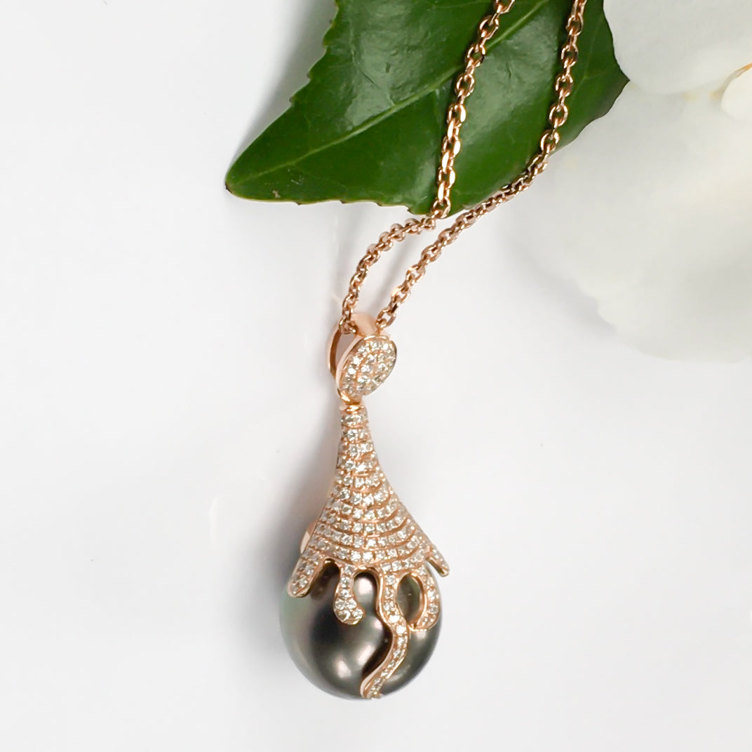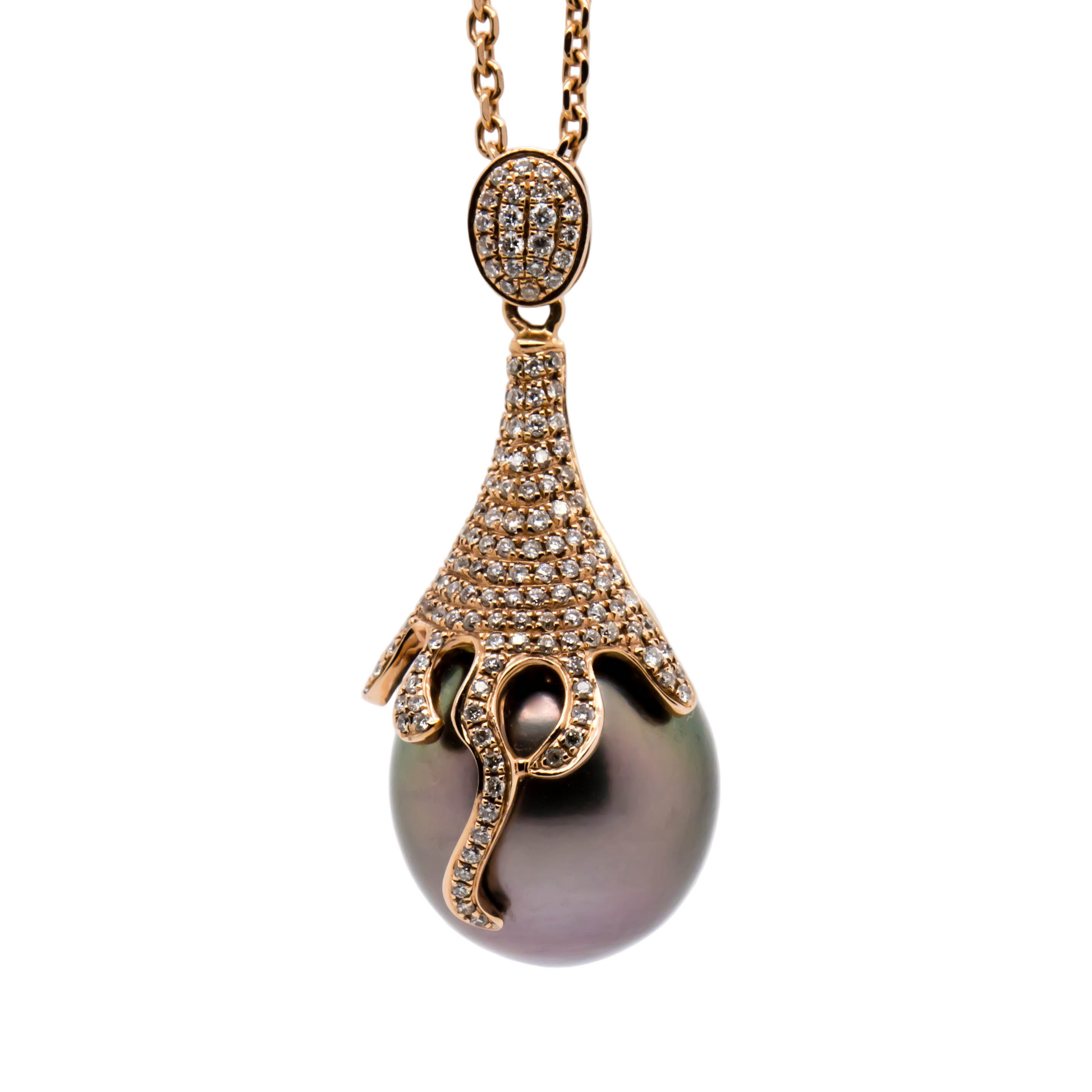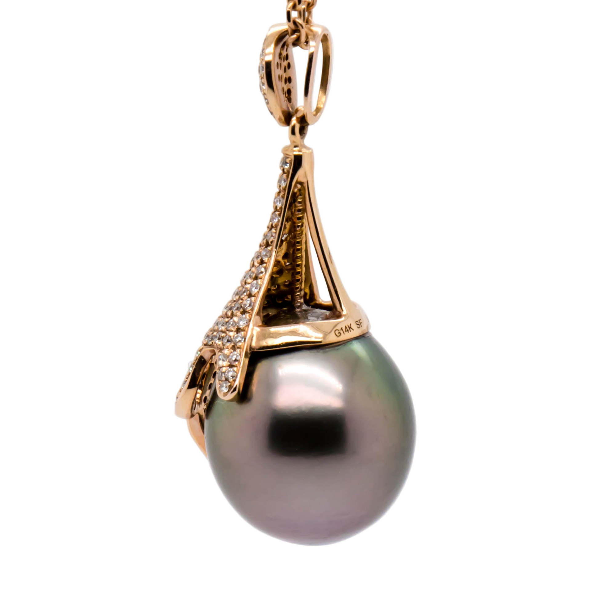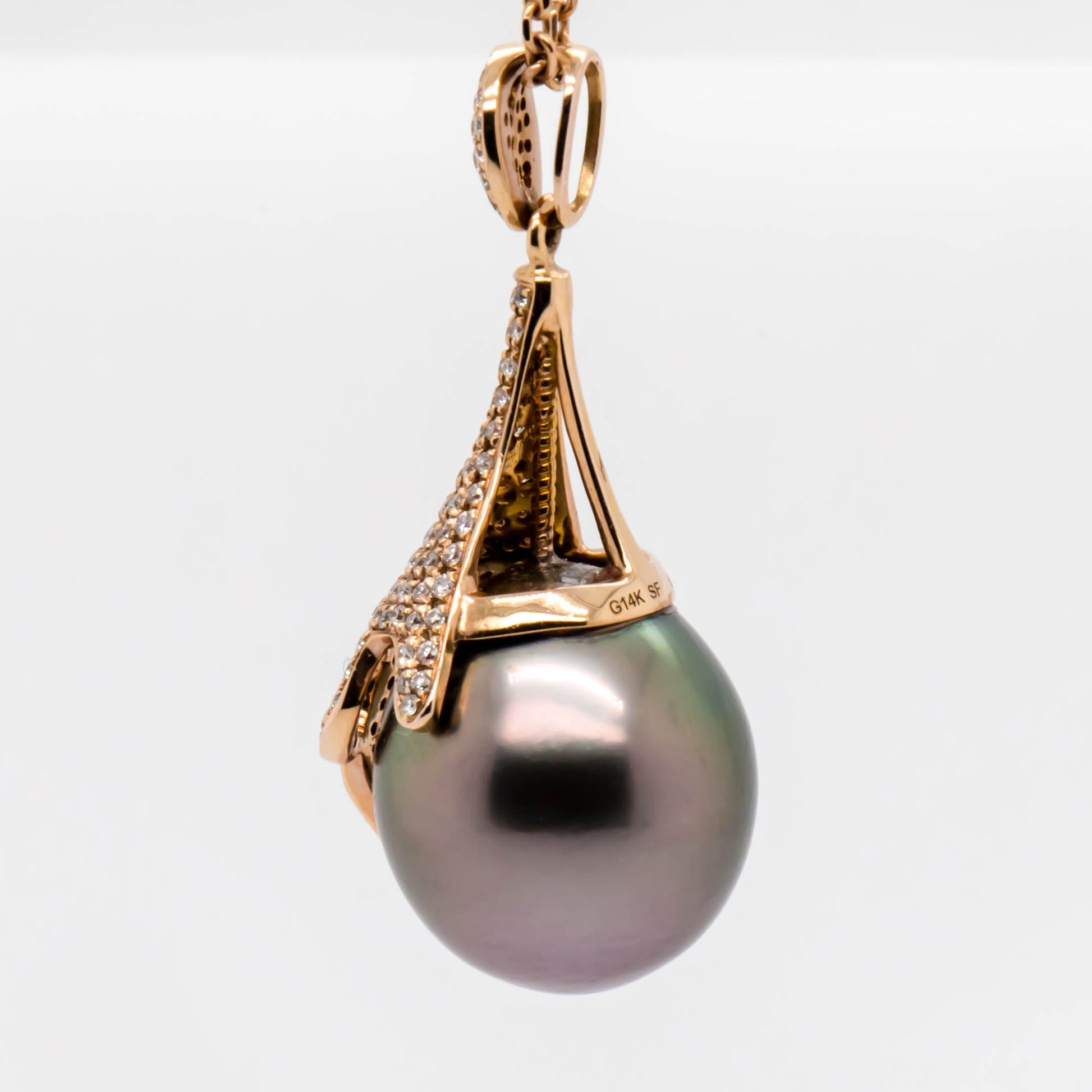 This elegant pendant features a striking 14.5mm Tahitian pearl suspended from a 14K rose gold setting, weighing 2.153g. The bail is adorned with 0.409ct of diamonds, adding refined brilliance to the piece. Perfectly blending timeless sophistication with modern luxury, this pendant makes a statement of understated elegance for any occasion. Please note, the chain is sold separately.