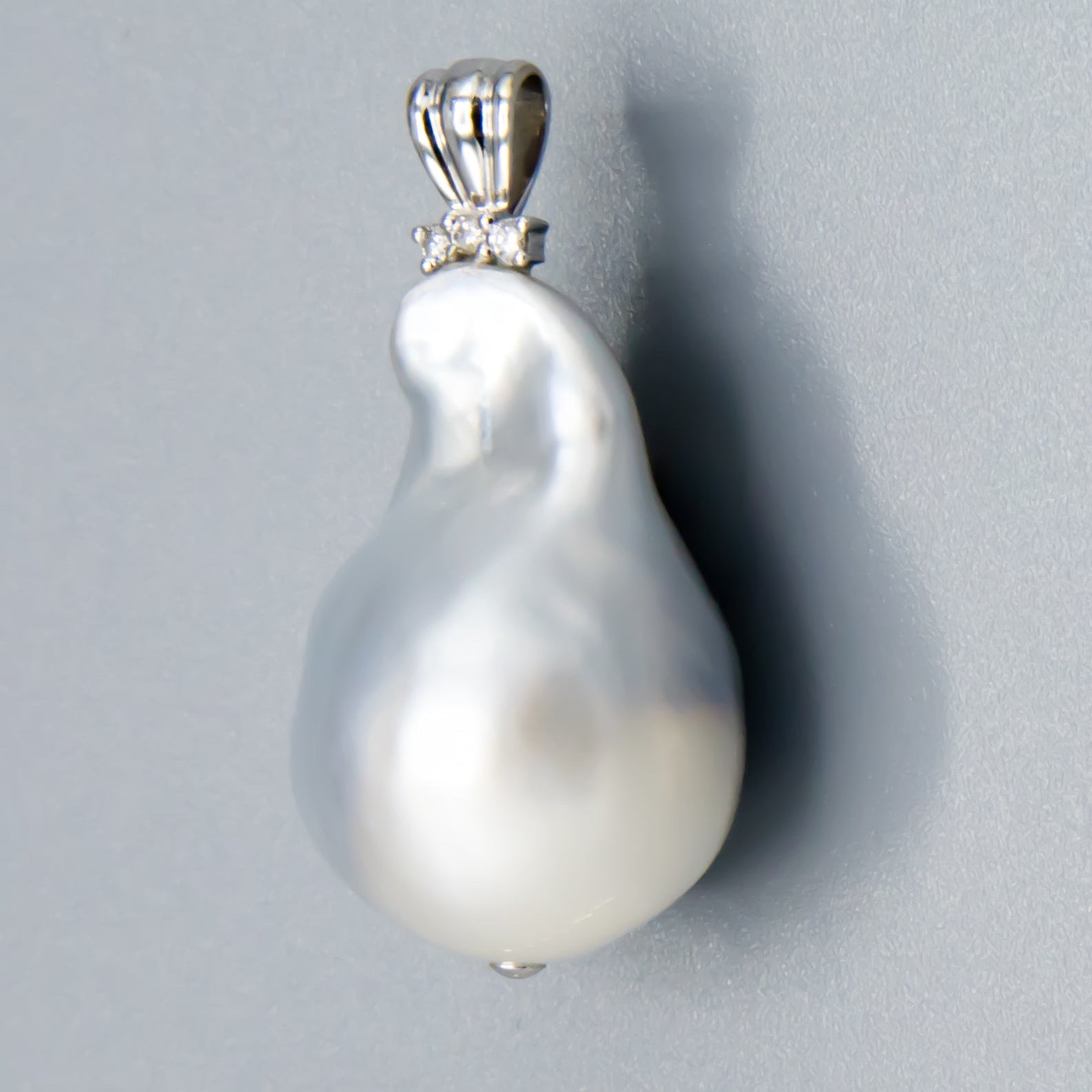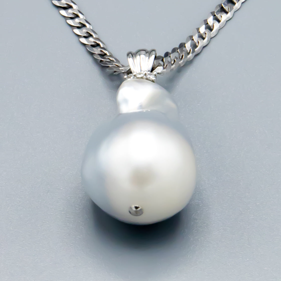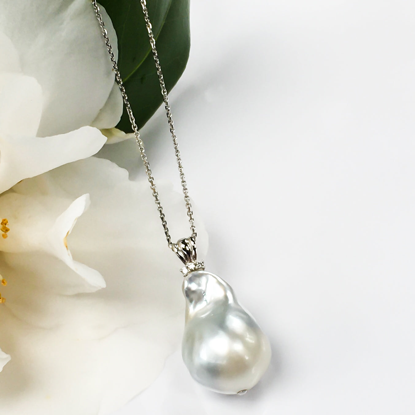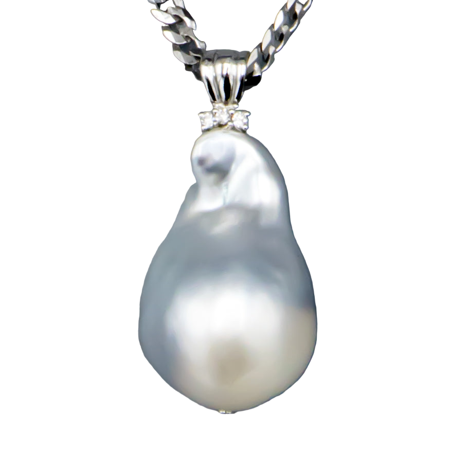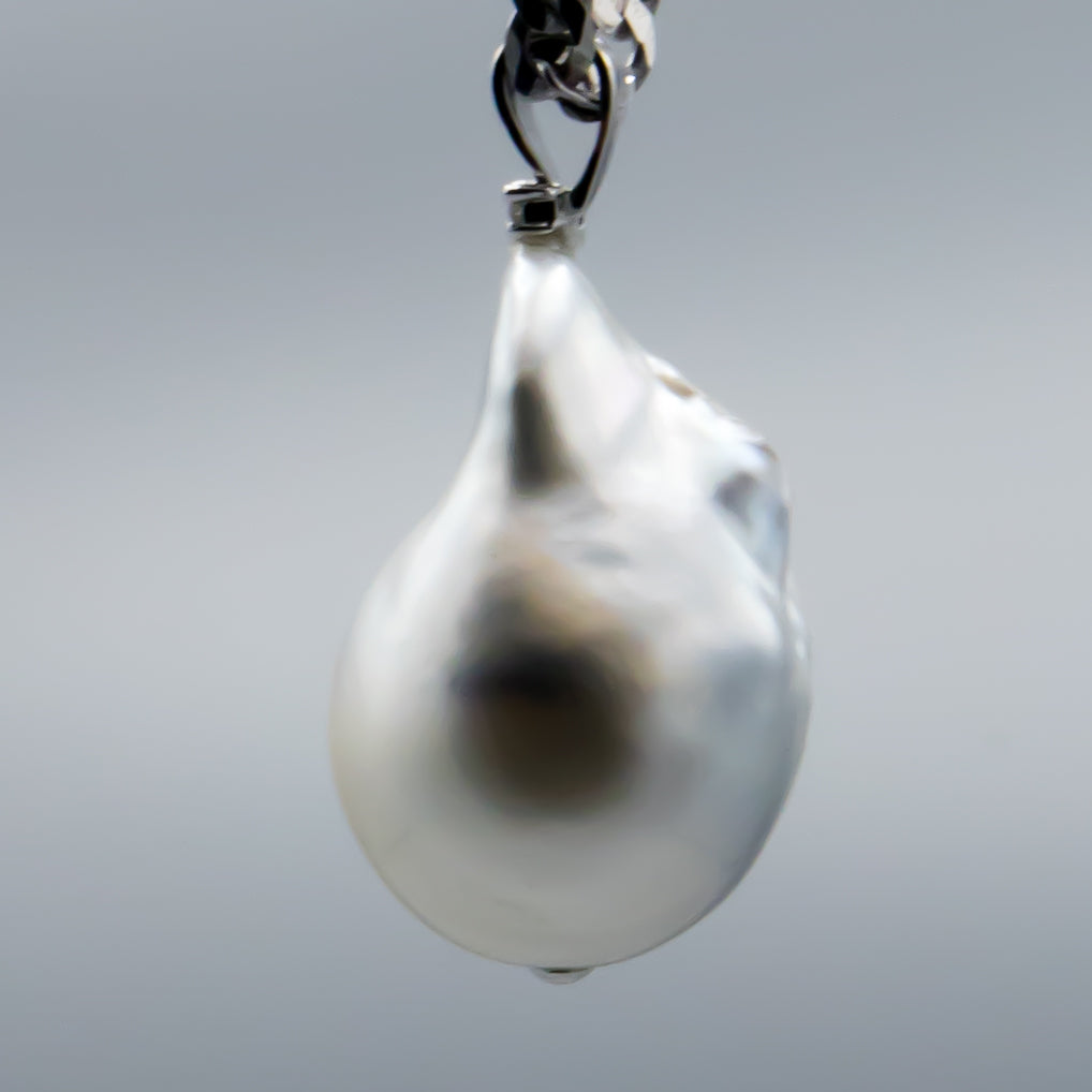 This pendant features a striking 15.5-16 mm baroque white South Sea saltwater cultured pearl, elegantly set in 14K white gold accented with dazzling diamonds. Its unique shape and luminous sheen make it a refined statement piece, perfect for adding timeless sophistication to any ensemble. Please note, the chain is sold separately.