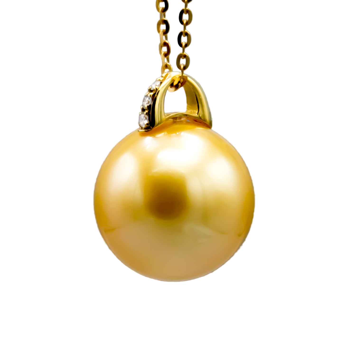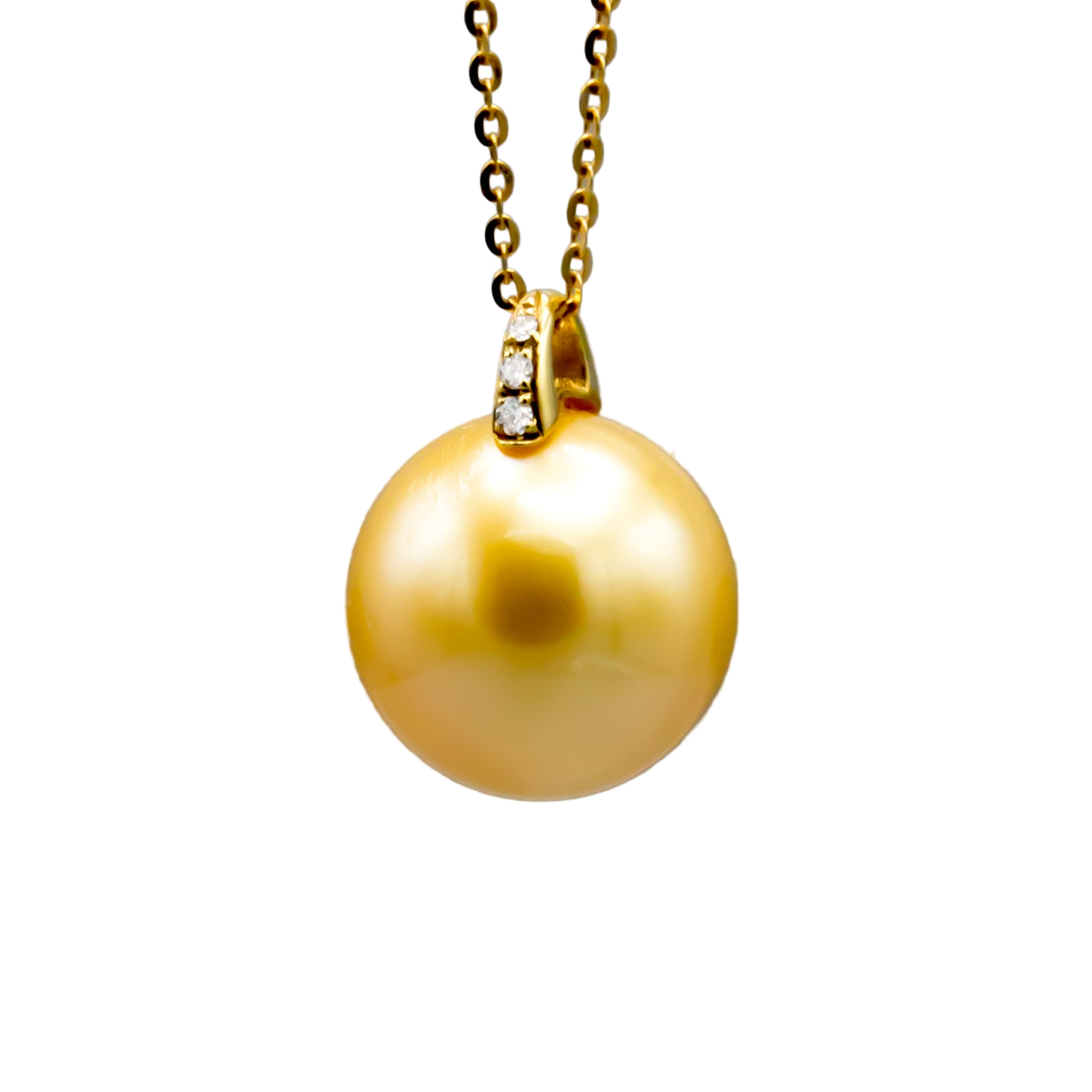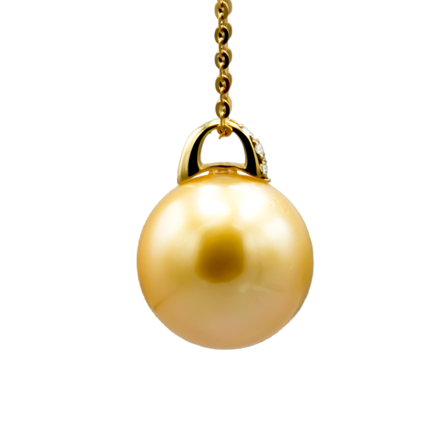 This exquisite pendant features a luminous 13.1mm round golden Southsea saltwater pearl elegantly suspended from a refined 18K yellow gold bail accented with sparkling diamonds. Its timeless design enhances any ensemble with subtle luxury. Please note, the chain is sold separately.